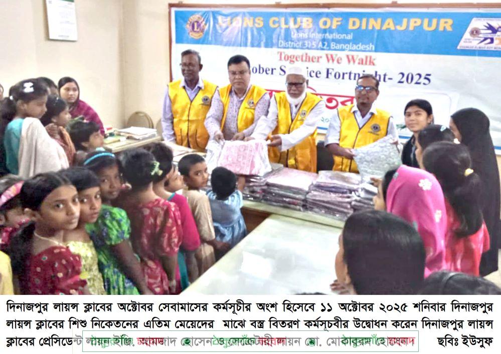 দিনাজপুর লায়ন্স ক্লাবের অক্টোবর সেবামাসের কর্মসূচীর অংশ হিসেবে শনিবার সকাল ১০টায় দিনাজপুর লায়ন্স ক্লাবের শিশু নিকেতনের এতিম মেয়েদের মাঝে বস্ত্র বিতরণ করা হয়েছে।
