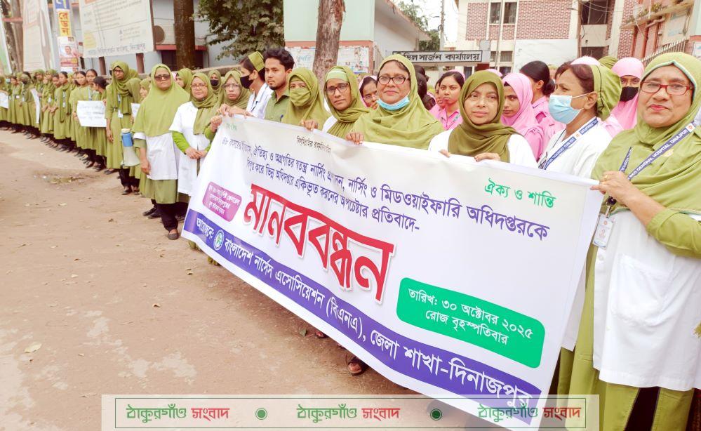 অপরদিকে একই দাবিতে একই সময়ে সিভিল সার্জন কার্যালয়ের সামনে ২৫০ শয্যাবিশিষ্ট দিনাজপুর জেনারেল হাসপাতালের নার্সিং কর্মকর্তা ও দিনাজপুর নার্সিং কলেজের শিক্ষক-শিক্ষার্থীরা মানবন্ধন কর্মসূচি পালন করেছে।