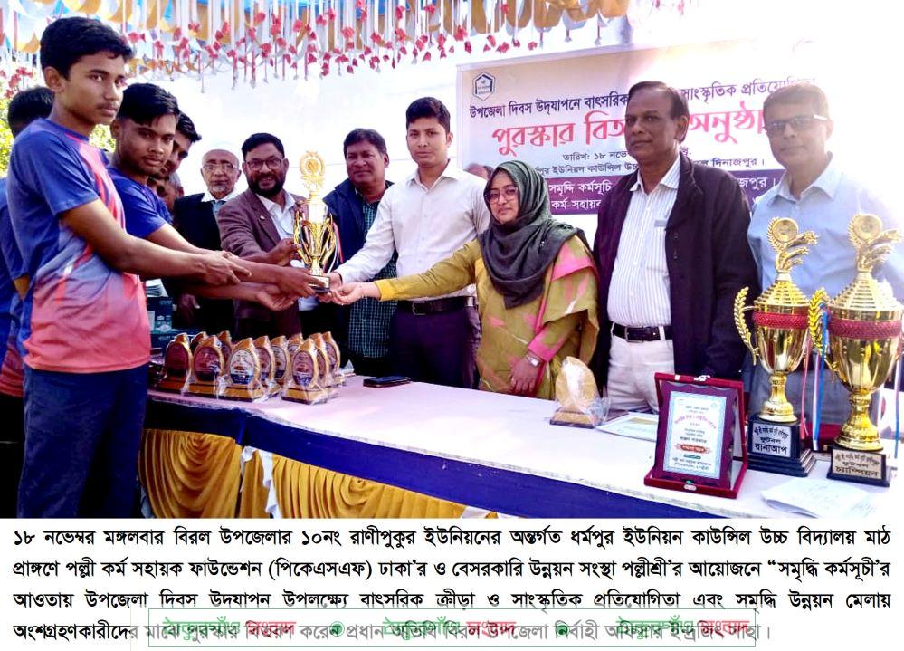 ১৮ নভেম্বর মঙ্গলবার বিরল উপজেলার ১০নং রাণীপুকুর ইউনিয়নের অন্তর্গত ধর্মপুর ইউনিয়ন কাউন্সিল উচ্চ বিদ্যালয় মাঠ প্রাঙ্গণে পল্লী কর্ম সহায়ক ফাউন্ডেশন (পিকেএসএফ) ঢাকা’র ও বেসরকারি উন্নয়ন সংস্থা পল্লীশ্রী’র আয়োজনে “সমৃদ্ধি কর্মসূচী’র আওতায় উপজেলা দিবস উদযাপন উপলক্ষ্যে বাৎসরিক ক্রীড়া ও সাংস্কৃতিক প্রতিযোগিতা এবং সমৃদ্ধি উন্নয়ন মেলায় অংশগ্রহণকারীদের মাঝে পুরস্কার বিতরণ অনুষ্ঠানে তিনি প্রধান অতিথির বক্তব্যে এ কথাগুলো বলেন। পল্লীশ্রী’র প্রোগ্রাম ম্যানেজার সৈয়দ মোস্তফা কামাল এর সভাপতিত্বে বিশেষ অতিথি হিসেবে বক্তব্য রাখেন উপজেলা যুব উন্নয়ন অফিসার মাহফুজার রহমান চৌধুরী, জগতপুর ডিগ্রী কলেজের অধ্যক্ষ মাসুদুর রহমান, দিনাজপুর মেডিকেল কলেজের চিকিৎসক প্রভাষক ডাঃ মোস্তাজ আফরিন সিলভী, এলাকার সমাজসেবক আলহাজ্ব শফিকুল আলম ও বিদ্যালয়ের প্রধান শিক্ষক মোঃ মোজ্জামেল হক। স্বাগত বক্তব্য রাখেন পল্লীশ্রী’র উপজেলা সমন্বয়কারী মোঃ রেজাউল করিম রেজা। প্রধান অতিথি বিরল উপজেলা নির্বাহী অফিসার ইন্দ্রæজিৎ সাহা বিজয়ীদের মাঝে পুরস্কার বিতরণ করেন। সভার শুরুতে তিনি সমৃদ্ধি উন্নয়ন মেলার প্রতিটি স্টল পরিদর্শন করেন।