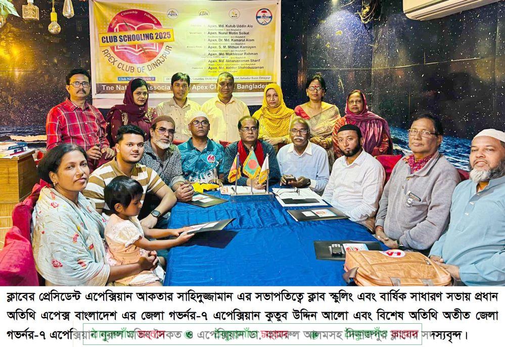 স্থানীয় মাসুম হোটেলে এপেক্স ক্লাব অব দিনাজপুর এর ক্লাব স্কুলিং এবং বার্ষিক সাধারণ সভা অনুষ্ঠিত হয়েছে শনিবার রাতে।