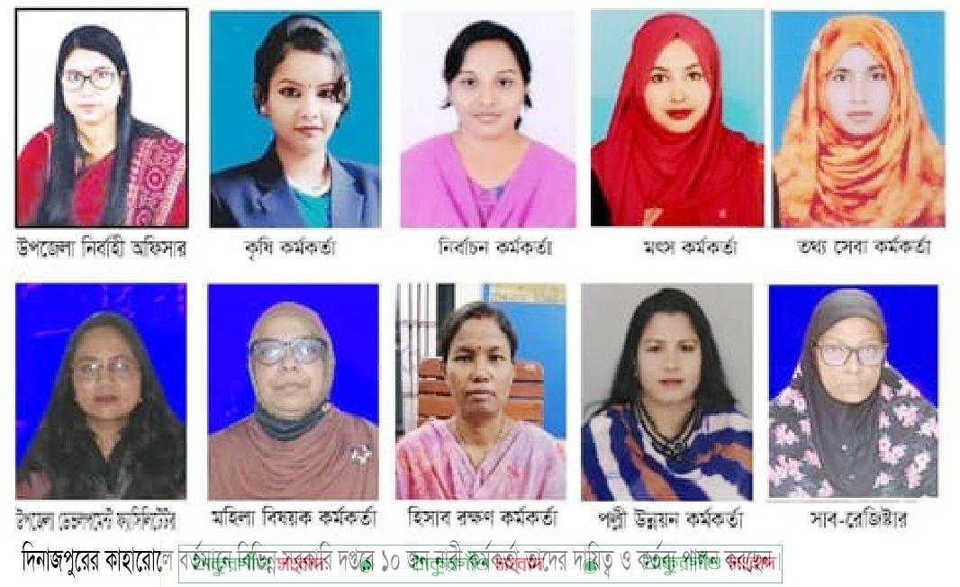 কাহারোল(দিনাজপুর) প্রতিনিধিঃ জাতীয় কবি বা বিদ্রোহী কবি কাজী নজরুল ইসলামের উক্তিতে “বিশে^ যা কিছু মহান সৃষ্টি চির কল্যাণকর, অর্ধেক তার করিয়াছে নারী, অর্ধেক তার নর”। তাইতো“জাগো নারী বহ্নিশিখা” মন্ত্রে উজ্জীবিত হয়ে দেশের গুরুত্বপূূর্ণ আসনে অধিষ্ঠিত হয়ে সততা ও নিষ্ঠার সঙ্গে দায়িত্ব পালন করে প্রতিটি ক্ষেত্রে দেশ গঠনের গুরুত্বপূর্ণ ভূমিকা রেখে চলেছেন দিনাজপুরের কাহারোল উপজেলায় গুরুত্বপূর্ণ পদে ১০ জন নারী কর্মকর্তারা এই উপজেলায় জনগণকে প্রতিনিয়ত সেবা দিয়ে যেতে দেখা যাচ্ছে। দেশের শীর্ষ নেতৃত্বের পদ ধরে দিনাজপুর জেলার কাহারোল উপজেলার বিভিন্ন সরকারি দপ্তরে বিভিন্ন পদে আসীন নারী কর্মকর্তারা নিজেদের ভাবমূতি তুলে ধরেছেন স্বমাহিমায়। উপজেলার প্রশাসনের ১০ জন নারী কর্মকর্তা নিজ নিজ দপ্তরে অবদান রেখে সুনাম অর্জন করে তাদের দায়িত্ব ও কর্তব্য পালন করে আসছেন।