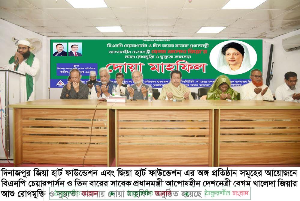 দিনাজপুর জিয়া হার্ট ফাউন্ডেশন এবং জিয়া হার্ট ফাউন্ডেশন এর অঙ্গ প্রতিষ্ঠান সমূহের আয়োজনে বিএনপি চেয়ারপার্সন ও তিন বারের সাবেক প্রধানমন্ত্রী আপোষহীন দেশনেত্রী বেগম খালেদা জিয়ার আশু রোগমুক্তি ও সুস্থ্যতা কামনায় দোয়া মাহফিল অনুষ্ঠিত হয়েছে।