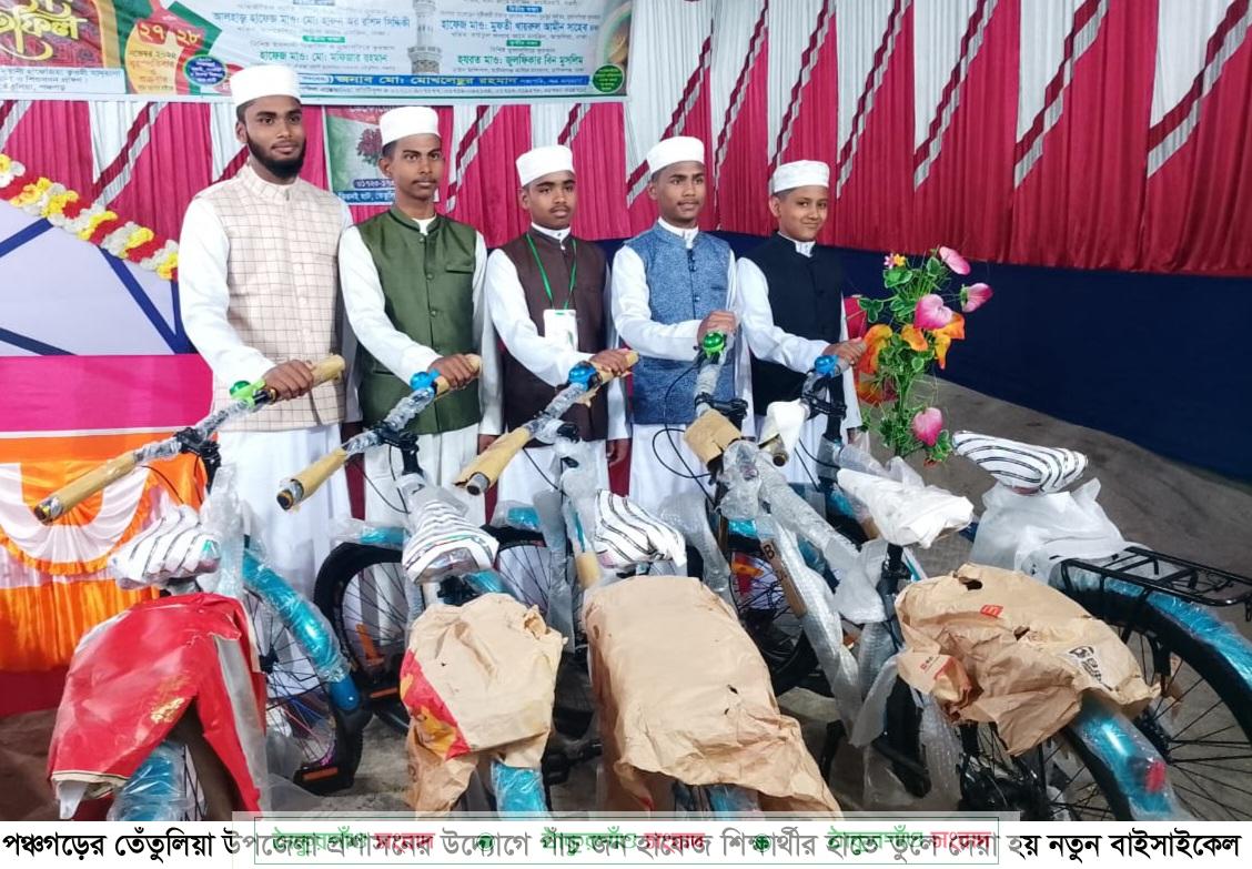 জানা যায়, জেলার তেঁতুলিয়া উপজেলার তিরনইহাট ইউনিয়নে অবস্থিত সরকারি ক্যাপিটেশন গ্রান্টভূক্ত তিরনইহাট এতিমখানা শিশু সদন ও নূরানী হাফেজিয়া ক্বওমী মাদ্রাসার পাঁচ শিক্ষার্থী দীর্ঘ পরিশ্রম আর নিয়মিত অধ্যবসায়ের মাধ্যমে শেষ করেন হেফজুল কোরআন। ৩০ পারা সম্পন্ন করে আনুষ্ঠানিকভাবে হাফেজ হওয়ার মুহূর্তে তারা পেলেন নতুন এক আনন্দ বাইসাইকেল উপহার। উপহারপ্রাপ্ত পাঁচ হাফেজ হলেন, তেঁতুলিয়া উপজেলার তিরনই ইউনিয়নের পিঠাখাওয়া এলাকার রফিকুল ইসলামের ছেলে হাফেজ মো. আব্দুল্লাহ নোমান, একই ইউনিয়নের দৌলতপাড়া এলাকার সমেত আলীর ছেলে হাফেজ মো. আলমগীর হোসেন, বাংলাবান্ধা ইউনিয়নের সিপাহীপাড়া জামাদারগছ এলাকার ফজর আলী ছেলে হাফেজ মো. নূরে আকসার আপন, তিরনই ইউনিয়নের মন্ডলপাড়া এলাকার উমের আলী ছেলে হাফেজ মো. মেহেদী হাসান ও দৌলতপুর এলাকার জাকির হোসেনের ছেলে হাফেজ মো. আব্দুল্লাহ আল সাঈদ।
