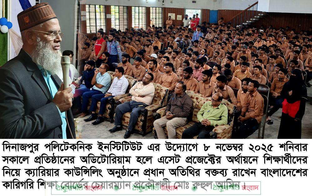 দিনাজপুর পলিটেকনিক ইনস্টিটিউট এর উদ্যোগে ৮ নভেম্বর ২০২৫ শনিবার সকালে প্রতিষ্ঠানের অডিটোরিয়াম হলে এসেট প্রজেক্টের অর্থায়নে শিক্ষার্থীদের নিয়ে ক্যারিয়ার কাউন্সিলিং অনুষ্ঠিত হয়ে।