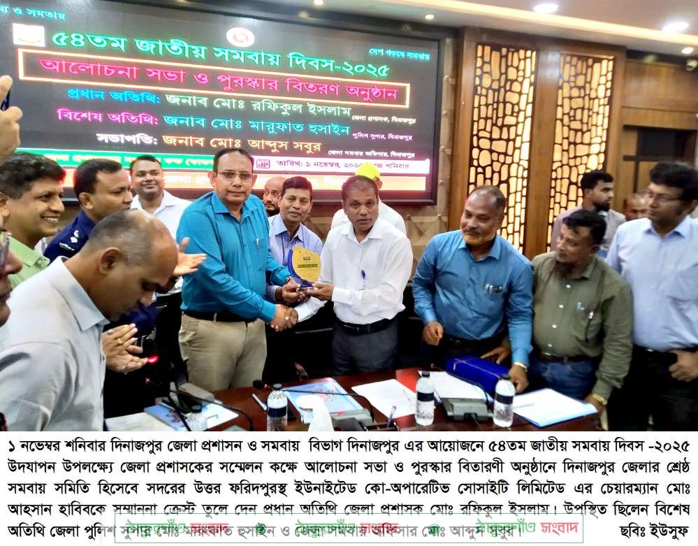 শনিবার দিনাজপুরে ৫৪তম জাতীয় সমবায় দিবস-২০২৫ উপলক্ষ্যে সদরের উত্তর ফরিদপুরস্থ ইউনাইটেড কো-অপারেটিভ সোসাইটি লিমিটেড এর জেলা প্রশাসন ও সমবায় কার্যালয়ের আয়োজনে র্যালী ও আলোচনা সভায় অংশগ্রহণ করে।