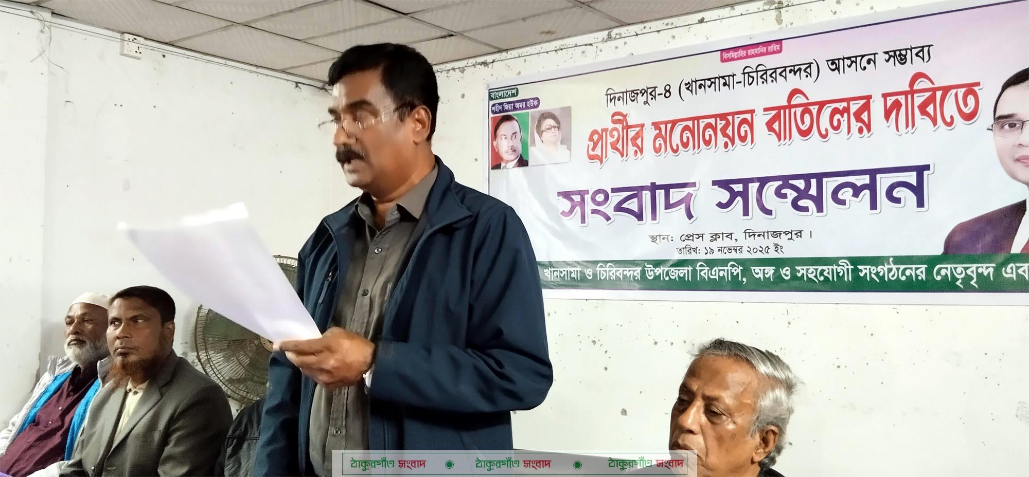 দিনাজপুর-৪ (খানসামা-চিরিরবন্দর) আসনে সম্ভাব্য বিএনপি প্রার্থীর মনোনয়ন বাতিলের দাবিতে দিনাজপুর প্রেসক্লাবে বুধবার সংবাদ সম্মেলন অনুষ্ঠিত হয়েছে। এতে খানসামা ও চিরিরবন্দর উপজেলা বিএনপি, অঙ্গ ও সহযোগী সংগঠনের নেতা-কর্মীসহ স্থানীয় গণ্যমান্য ব্যক্তিবর্গ উপস্থিত ছিলেন। সন্ধ্যায় তারা মৌন মিছিল নিয়ে দিনাজপুর প্রেস ক্লাবে সমবেত হন।