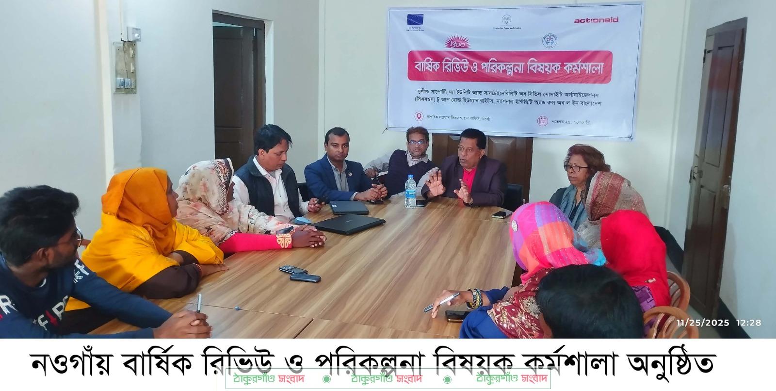 নাগরিক সংযোগ সিএসও হাব নওগাঁ ও বরেন্দ্র ডেভেলপমেন্ট অর্গানাইজেশন(বিডিও) এর আয়োজনে, একশনএইড ও ইউরোপিয়ানের সহযোগিতায় (২৫নভেম্বর) মঙ্গলবার বেলা ১১টায় রানী এনজিও’র প্রধান নির্বাহী ফজলুল হক খান এর সভাপতিত্বে নাগরিক সংযোগ সিএসও হাব অফিস, নওগাঁয় সুশীল সাপোর্টিং দ্যা ইউনিটি অ্যাড সাসটেইনেবিলিটি অব সিভিল সোসাইটি অর্গানাইজেশনস (সিএসওস) টু আপ হোল্ড হিউম্যান রাইটস,ন্যাশনাল ইন্টিগ্রিটি অ্যাড রুল অব ল ইন বাংলাদেশ’র বার্ষিক রিভিউ ও পরিকল্পনা বিষয়ক কর্মশালায় বিগত সময়ের কাজের পর্যালোচনা তুলে ধরেন সুশীল প্রকল্পের জেলা সমন্বয়কারী শামসুল হক। উক্ত বিষয়ের উপর বক্তব্য প্রদান করেন নিশান এনজিও’র প্রধান নির্বাহী মাহিদুর রহমান,আসাফউদ্দৌলা ক্রেডিট সুপারভাইজার বিডিও।