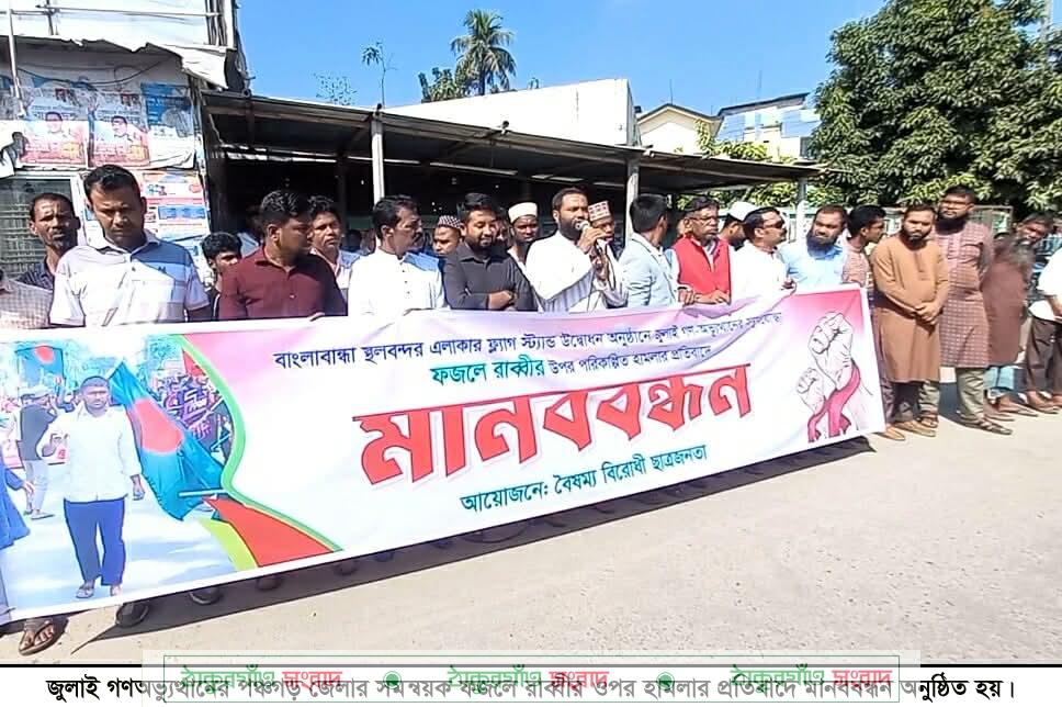 পঞ্চগড়ের তেঁতুলিয়া উপজেলার বাংলাবান্ধা স্থলবন্দর এলাকায় দেশের সর্বোচ্চ পতাকা স্ট্যান্ড উদ্বোধন অনুষ্ঠানে জুলাই গণঅভ্যুত্থানের পঞ্চগড় জেলার সমন্বয়ক ফজলে রাব্বীর ওপর হামলার প্রতিবাদে মানববন্ধন অনুষ্ঠিত হয়েছে। গতকাল বৃহস্পতিবার দুপুরে বৈষম্য বিরোধী ছাত্রজনতার ব্যানারে পঞ্চগড় শহরের চৌরঙ্গী মোড় এলাকায় কেন্দ্রীয় শহীদ মিনারের সামনে পঞ্চগড়-ঢাকা মহাসড়কের একপাশে দাড়িয়ে ঘন্টাব্যাপী ওই মানববন্ধন কর্মসূচি পালন করা হয়।