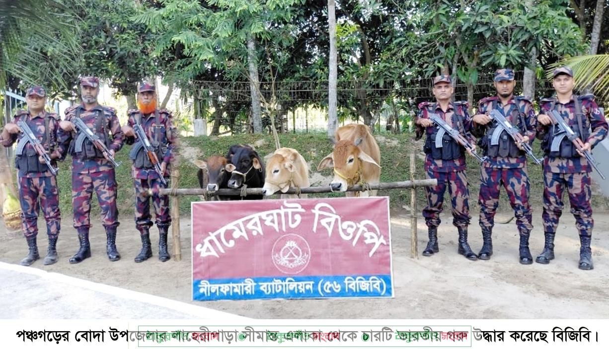 প্রেস বিজ্ঞপ্তিতে জানানো হয়, বৃহস্পতিবার ভোরে গোপন সংবাদের ভিত্তিতে নীলফামারী ৫৬ বিজিবির অধিনস্থ ধামেরঘাট বিওপির একটি টহল দল সীমান্ত পিলার ৭৭০/১-এস হতে বাংলাদেশের অভ্যন্তরে লাহেরীপাড়ায় অভিযান চালিয়ে মালিকবিহীন অবস্থান ৪টি ভারতীয় গরু উদ্ধার করে।
