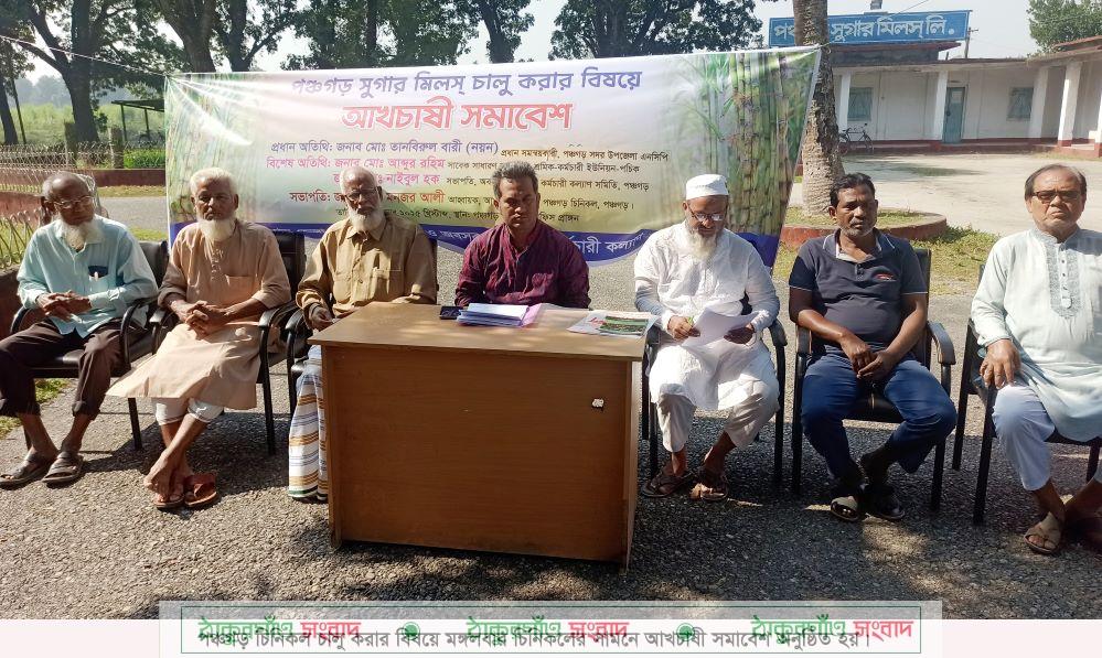 পঞ্চগড় চিনিকল চালু করার বিষয়ে আখচাষী সমাবেশ অনুষ্ঠিত হয়েছে। গতকাল মঙ্গলবার দুপুরে পঞ্চগড় চিনিকল অফিস চত্বরে পঞ্চগড় জেলা আখচাষী সমিতি ও অবসরপ্রাপ্ত শ্রমিক কর্মচারী কল্যাণ সমিতি ওই সমাবেশের আয়োজন করে। পঞ্চগড় আখচাষী সমিতির আহ্বায়ক মনজর আলীর সভাপতিত্বে অনুষ্ঠানে প্রধান অতিথি হিসেবে বক্তব্য রাখেন সদর উপজেলা জাতীয় নাগরিক পার্টি-এনসিপি’র প্রধান সমন্বয়কারী তানবিরুল বারী নয়ন। এ সময় পঞ্চগড় চিনিকলের অবসরপ্রাপ্ত শ্রমিক কর্মচারী কল্যাণ সমিতির সভাপতি নাইবুল হক, সাবেক সাধারণ সম্পাদক আব্দুর রহিমসহ চিনিকলের শ্রমিক, কর্মচারী, আখচাষী ও সংশ্লিষ্টরা উপস্থিত ছিলেন।