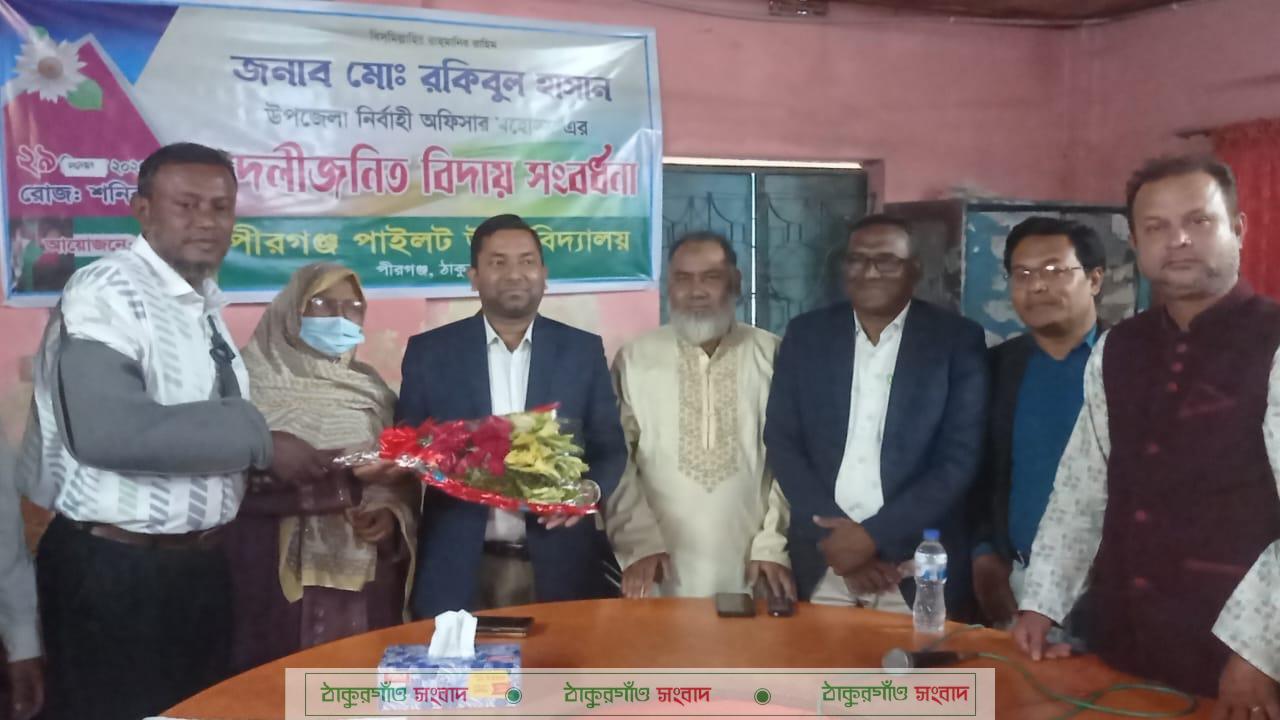 পীরগঞ্জ(ঠাকুরগাঁও)প্রতিনিধি ঃ ঠাকুরগাঁওয়ে পীরগঞ্জে উপজেলা নির্বাহী অফিসার রকিবুল হাসানকে বদলি জনিত বিদায় সংবর্ধনা দেওয়া হয়েছে। শনিবার বিকালে পীরগঞ্জ পাইলট উচ্চ বিদ্যালয়ের পক্ষ থেকে এ সংবর্ধনা দেওয়া হয়। পাইলট উচ্চ বিদ্যালয়ের সভা কক্ষে ভারপ্রাপ্ত প্রধান শিক্ষক শাহজালাল সাজুর সভাপতিত্বে সংবর্ধনা সভায় বক্তব্য দেন, উপজেলা নির্বাহী অফিসার রকিবুল হাসান, পীরগঞ্জ প্রেসক্লাবের সভাপতি জয়নাল আবেদিন বাবুল, সাধারণ সম্পাদক নসরতে খোদা রানা, উপজেলা দুর্নীতি প্রতিরোধ কমিটির সাধারণ সম্পাদক ও সিনিয়র সাংবাদিক মোকাদ্দেস হায়াত মিলন, শিক্ষক সোহেল রানা, ফেরদৗসী বেগম, শাহ নেওয়াজ প্রমূখ।