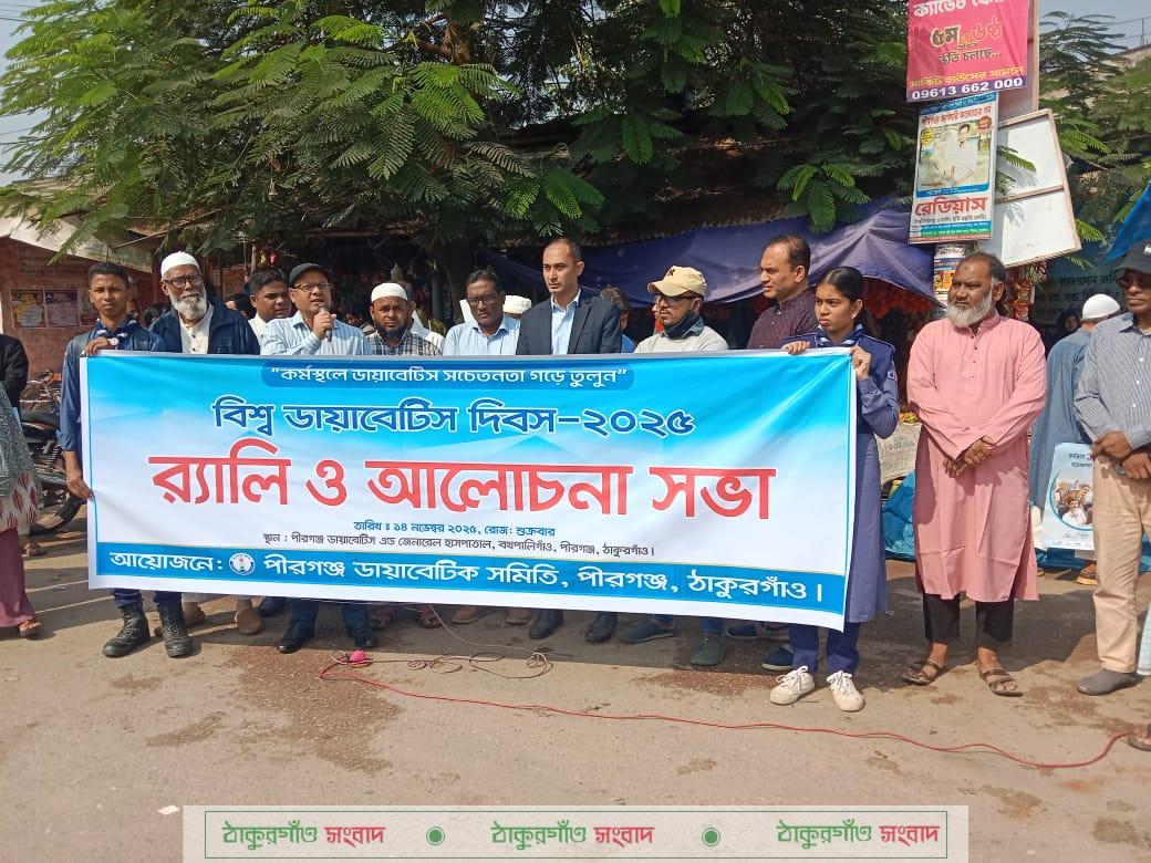 পীরগঞ্জ (ঠাকুরগাঁও) প্রতিনিধি ঃ বিশ্ব ডায়াবেটিস দিবস উপলক্ষে র্যালী ও আলোচনা সভা হয়েছে ঠাকুরগাঁওয়ের পীরগঞ্জে। শুক্রবার সকালে পীরগঞ্জ ডায়াবেটিক সমিতির আয়োজনে পীরগঞ্জ ডায়াবেটিস এন্ড জেনারেল হাসপাতাল থেকে র্যালী বের করা হয়। র্যালীটি উপজেলা স্বাস্থ্য কমপ্লেক্স হয়ে পীরগঞ্জ পৌর শহরের বিভিন্ন সড়ক প্রদক্ষিন করে শহরে পূর্ব চৌরাস্তায় মিলিত হয়। সেখানে পথসভায় বক্তব্য দেন, সহকারী কমিশনার (ভুমি) এন এম ইসফাকুল কবীর, পীরগঞ্জ সরকারী কলেজের অধ্যক্ষ প্রফেসর বদরুল হুদা, উপজেলা স্বাস্থ্য কর্মকর্তা ডাঃ কামাল হোসেন, উপজেলা বিএনপির সাধারণ সম্পাদক ও সাবেক উপজেলা চেয়ারম্যান জিয়াউল ইসলাম জিয়া, পীরগঞ্জ ডায়াবেটিক সমিতির সাধারণ সম্পাদক জয়নাল আবেদিন বাবুল, সহ সভাপতি ও সাবেক উপজেলা জামায়াতের আমীর বাবলুর রশীদ, কার্য নির্বাহী সদস্য ও ডায়াবেটিস সমিতির আজীবন সদস্য রুহুল আমীন, ডায়াবেটিক সমিতির আজীবন সদস্য ইলিয়াস আলী, মোকাদ্দেস হায়াত মিলন প্রমূখ। র্যালী এবং পথ সভায় সরকারী কর্মকর্তা, শিক্ষক, উপজেলা স্বাস্থ্য কেন্দ্রে ও ডায়াবেটিস হাসপাতালের কর্মকর্তা কর্মচারী, শিক্ষক, সাংবাদিক, ডায়াবেটিক সমিতির সদস্যবৃন্দ সহ সুশীল সমাজের প্রতিনিধিরা অংশ নেয়। পরে পীরগঞ্জ ডায়াবেটিস এন্ড জেনারেল হাসপাতালে আলোচনা সভা হয়। পীরগঞ্জ ডায়াবেটিক সমিতির সহ সভাপতি বাবলুর রশীদের সভাপতিত্বে অনুষ্ঠিত সভায় বক্তব্য দেন পীরগঞ্জ ডায়াবেটিক সমিতির নেতৃবৃন্দ ছাড়াও সমিতির আজীবন সদস্য ও সাবেক উপজেলা ভাইস চেয়ারম্যান আশরাফ আলী বাদশা, বকুল আলম প্রমূখ।