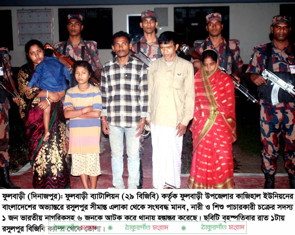 এদিকে ফুলবাড়ী ২৯ ব্যাটালিয়নের অধীনস্থ রসুলপুর বিওপির একটি টহলদল গোপন সূত্রে জানতে পারে যে আন্তর্জাতিক শুন্য রেখা থেকে প্রায় ১৪০ গজ বাংলাদেশের অভ্যন্তরে সীমান্ত এলাকার রসুলপুর পলিপাড়া গ্রামের বাংলাদেশী নাগরিক মৃত জাহিরুল চৌধুরীর ছেলে আফিত এর বাড়িতে কয়েকজন ভারতীয় নাগরিক বাংলাদেশ থেকে ভারতে প্রবেশের জন্য একত্রিত হয়েছে। বৃহস্পতিবার (৬ নভেম্বর) বিজিবি সদস্যরা তাতখনিক অভিযান চালিয়ে বাড়িটি ঘিরে ফেলে তল্লাশি চালিয়ে তাদের আটক করে।