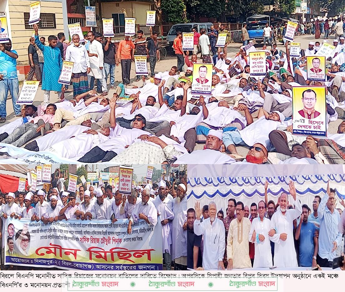 শুক্রবার সকালে বিরল উপজেলা শহরের বকুলতলা মোড়ে প্রায় ঘন্টা ব্যাপী মৌন ও বিক্ষোভ মিছিল করে বিএনপি’র একাংশের নেতাকর্মী ও সাধারণ মানুষ। রাস্তার দুই ধারে শত শত নেতাকর্মী ও সাধারণ মানুষ মনোনীত প্রার্থীর বিরুদ্ধে বিক্ষোভ করতে থাকে। এসময় অনেকে কাপনের কাপড় পড়ে বিক্ষোভে অংশ নেন।