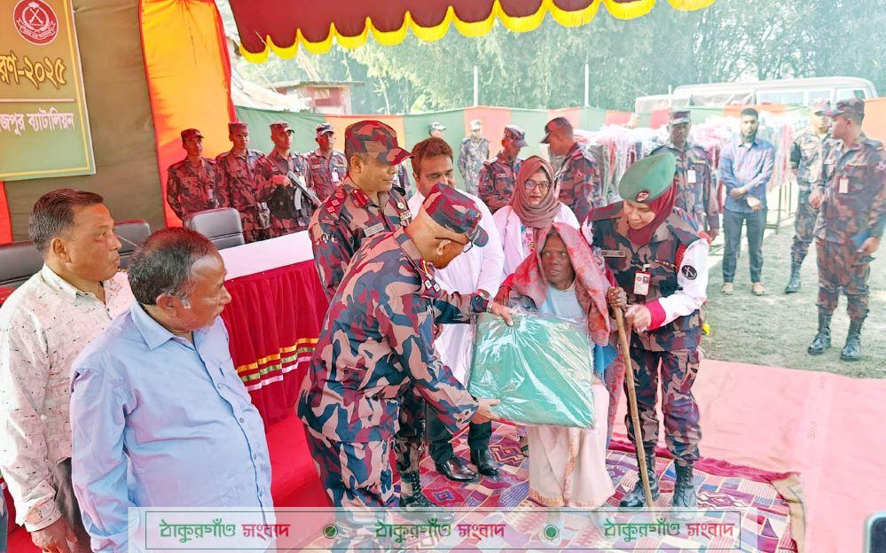 শনিবার সকাল ১০টায় বিরল উপজেলার অন্তর্গত ডুংডুঙ্গি বিওপি’র দায়িত্বপূর্ণ এলাকার ধর্মপুর ইউনিয়নের দক্ষিণ মেড়াগাঁও গ্রামের দক্ষিণ মেড়াগাঁও সরকারি প্রাথমিক বিদ্যালয় মাঠে সীমান্ত এলাকায় বসবাসরত স্থানীয় শীতার্ত ও অসহায় মানুষের মাঝে ৩০০টি শীতবস্ত্র (কম্বল) এবং বাচ্চাদের জন্য ১০০টি বস্ত্র বিতরণ করা হয়। এছাড়াও স্থানীয় ৫০০জন নারী-পুরুষ ও শিশুকে চিকিৎসকদের মাধ্যমে বিনামূল্যে চিকিৎসা পরামর্শ ও প্রয়োজনীয় ওষুধ প্রদান করা হয়।