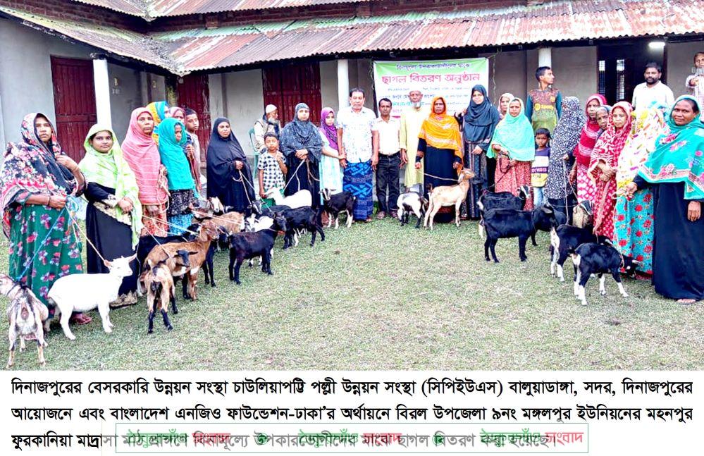 দিনাজপুরের বেসরকারি উন্নয়ন সংস্থা চাউলিয়াপট্টি পল্লী উন্নয়ন সংস্থা (সিপিইউএস) বালুয়াডাঙ্গা, সদর, দিনাজপুরের আয়োজনে এবং বাংলাদেশ এনজিও ফাউন্ডেশন-ঢাকা’র অর্থায়নে বিরল উপজেলা মঙ্গলপুর ইউনিয়নের মহনপুর ফুরকানিয়া মাদ্রাসা মাঠ প্রাঙ্গণে বিনামূল্যে উপকারভোগীদের মাঝে ছাগল বিতরণ করা হয়েছে।