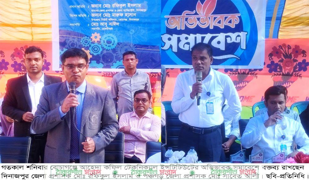 শনিবার সকাল ১১টায় ইন্সটিটিউট মাঠে উক্ত ইন্সটিটিউটের পরিচালনা কমিটির সভাপতি মোঃ আবু সাঈদ এর সভাপতিত্বে দিনাজপুরের বোচাগঞ্জ উপজেলার আটগাঁও ইউনিয়নে অবস্থিত বে-সরকারি আহেদা কফিল টেকনিক্যাল ইন্সটিটিউট (একেটিআই) এ অভিভাবক সমাবেশে প্রধান অতিথি হিসেবে উপরোক্ত কথা বলেন দিনাজপুর জেলা প্রশাসক মোঃ রফিকুল ইসলাম ও পঞ্চগড় জেলা প্রশাসক মোঃ সাবেত আলী।