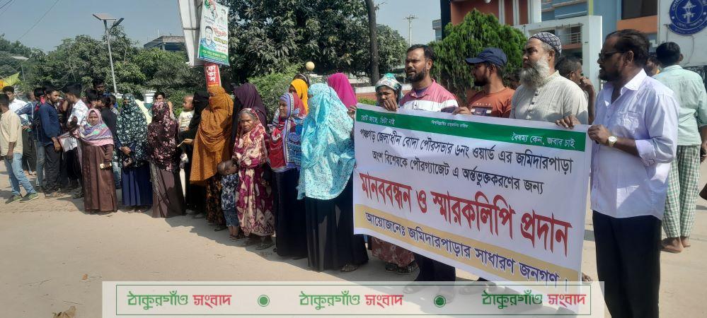 বোদা,পঞ্চগড় প্রতিনিধি॥পঞ্চগড় জেলার বোদা উপজেলার বোদা পৌরসভা ৬নং ওয়ার্ডের ফুলচান শাহামনি মৌজার অর্ন্তভুক্ত জমিদারপাড়া গ্রামের প্রায় ৮শত জন বাসিন্দা দীর্ঘ ১বছর ধরে নাগরিক সেবা থেকে বঞ্চিত রয়েছেন। জন্ম-মৃত্যু সনদ, নাগরিকত্ব সনদ, ওয়ারিশন সনদসহ নাগরিক সেবার সকল সুবিধা ভোগ করতে না পেরে তারা চরম বিপাকে পড়েছে। ওই এলাকাটিকে বোদা পৌরসভার অর্ন্তভুক্ত করে গ্যাজেট প্রকাশসহ সকল প্রকার নাগরিক সুবিধার দাবীতে জমিদারপাড়া গ্রামের কয়েকশত বাসিন্দা মঙ্গলবার দুপুরে বোদা পৌর কার্যালয়ের সামনে বিক্ষোভ প্রদর্শনসহ ঘন্টাব্যাপী মানববন্ধন কর্মসূচী পালন করে উপজেলা নির্বাহী অফিসার বরাবরে স্মারকলিপি প্রদান করেছেন। মানববন্ধন কর্মসূচীতে অনুষ্ঠিত সমাবেশে ওই ওয়ার্ডের সাবেক কাউন্সিলর আবু সাদাত মোঃ সায়েম রুবেল, এলাকাবাসী আফসার আলী, জেসমিন আক্তার, নুরুজ্জামান, হামিদুল ইসলাম, জুলফিকার আলী, দেলজান বেগম ও রুমি আক্তার বলেন বোদা পৌরসভা গঠনের আগে জমিদারপাড়া এলাকাটি উপজেলার চন্দনবাড়ির ইউনিয়নের অর্ন্তভুক্ত ছিলো। পৌরসভা গঠনের পর ওই এলাকাটি পৌরসভার অর্ন্তভুক্ত হয়েছে বলে আমরা জানতে পারি। তারপর থেকে আমরা এলাকাবাসী পৌরসভায় ট্যাক্স প্রদান করে জন্ম-মৃত্যু সনদ, নাগরিকত্ব সনদ, ওয়ারিশন সনদসহ নাগরিক সেবার সকল সুবিধা ভোগ করে আসছি। জাতীয় পরিচয়পত্রেও আমাদের এলাকাটি বোদা পৌর এলাকা হিসেবে উল্লেখ রয়েছে। ২০১৮ ও ২০২৪ সালের পৌরসভা নির্বাচনে আমরা ভোট প্রদান করেছি। পৌরসভা গঠনের পর থেকে পৌরসভা থেকে আমরা এসকল সুযোগ-সুবিধা গ্রহণ করে আসছি। ইতিমধ্যে আমাদের এলাকায় পৌরসভা থেকে অনেক উন্নয়নমুলক কাজ হয়েছে। গত ১ বছর ধরে পৌরসভা আমাদের এসকল সেবা থেকে বঞ্চিত রেখেছে। পৌরসভা হতে নাগরিক সেবা না পেয়ে আমরা চরম বিপাকে পড়েছি। পৌরসভায় সেবা নিতে আসলে পৌরসভার কর্মকর্তারা জানান ২০১৬ সালের গ্যাজেট প্রকাশের সময় ফুলচান শাহামনি মৌজার কিছু দাগ নম্বর গ্যাজেটে অর্ন্তভুক্ত হয়নি। পৌর কর্তৃপক্ষরা আমাদের চন্দনবাড়ি ইউনিয়ন পরিষদ হতে নাগরিক সেবা গ্রহণের পরামর্শ দেন। তাদের কথামত চন্দনবাড়ি ইউনিয়ন পরিষদ হতে সেবা নিতে গেলে তারা আমাদের সেবা না দিয়ে সেখান থেকে তাড়িয়ে দেন এবং বলেন আপনারা পৌরসভার নাগরিক পৌরসভা থেকে সেবা গ্রহণ করেন। ওই গ্রামের বাসিন্দা দেলজান বেগম বলেন ছেলের জন্ম নিবন্ধন সনদের জন্য ৮মাস থেকে পৌরসভায় ঘুরতেছি আজও কোন সমাধান পাই নি। একই গ্রামের রুমি আক্তার বলেন বীমার প্রিমিয়াম তুলতে শ্বশুরের মৃত্যুর সনদের জন্য ২০দিন ধরে পৌরসভায় আসা-যাওয়া করছি আমার কথায় কেউ কর্ণপাত করে না। পৌরসভা বলতেছে ইউনিয়ন পরিষদে যাও আর ইউনিয়ন পরিষদ বলতেছে পৌরসভা যাও। এলাকাবাসীরা নাগ