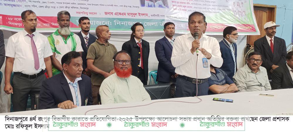 দিনাজপুর জেলা ক্রীড়া সংস্থার আয়োজনে ও বাংলাদেশ কারাতে ফেডারেশনের ব্যবস্থাপনায় দিনব্যাপী দিনাজপুর জিমন্যাসিয়ামে ৪র্থ রংপুর বিভাগীয় কারাতে প্রতিযোগিতা-২০২৫ উপলক্ষে আলোচনা সভা ও পুরস্কার বিতরণী অনুষ্ঠান অনুষ্ঠিত হয়েছে।
