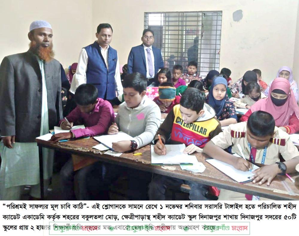 “পরিশ্রমই সাফল্যর মূল চাবি কাঠি”- এই শ্লোগানকে সামনে রেখে ১ নভেম্বর শনিবার সরাসরি টাঙ্গাইল হতে পরিচালিত শহীদ ক্যাডেট একাডেমি কর্তৃক শহরের বকুলতলা মোড়, ক্ষেত্রীপাড়াস্থ শহীদ ক্যাডেট স্কুল দিনাজপুর শাখায় দিনাজপুর সদরের ৫০টি স্কুলের প্রায় ২ হাজার শিক্ষার্থী প্রতি বছরের মত এবারো মেধা বৃদ্ধি পরীক্ষায় অংশগ্রহণ করছে।