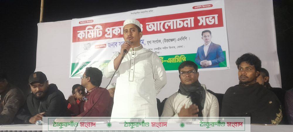 তিনি আরো বলেন যেকোনো রাজনৈতিক দলের যত বড় দলেরই নেতা হোক না কেন, সে যদি কোন অপকর্মের সাথে জড়িত থাকে, আপনারা প্রত্যক্ষভাবেই হোক পরোক্ষভাবে হোক প্রকাশ্যে হোক কিংবা যেদিন ভোট দিবেন গোপনে সেদিন আপনাদের রায়টা সত্য ও ন্যায়ের পক্ষে দিতে হবে। ঐদিন যদি আপনারা কোন ব্যক্তি, দল, মার্কার কাছে অন্ধ হয়ে যান, তাহলে পরের পাঁচ বছরে আপনাদের উপর যে কোন অন্যায় অপকর্ম হলে এই দায় আপনিও এড়াতে পারেন না। কারন আপনার যখন দায়িত্ব ছিল, আপনি আপনার কাজটা করেন নাই। দাদা কোথায় ভোট দিয়েছে, বাবা কোথায় ভোট দিয়েছে এটা চিন্তা করে যদি আমি দেই, তাহলে দাদা বাবার সময়ে দেশের যা অবস্থা ছিল যে শোষণ, ছিল জুলুম ছিল, সেটাই হবে কোন পরিবর্তন হবে না। তিনি বলেন, বিগত ফ্যাসিস্ট সরকার হাসিনার আমলে স্বৈরাচারের বিরুদ্ধে লড়াই সংগ্রামে কখনই মাথা নত করেননি সাবেক প্রধান মন্ত্রী বেগম খালেদা জিয়া। তিনি আপোষহীনভাবে তার জায়গা থেকে লড়াই সংগ্রাম করেছেন। আমরা এনসিপির পক্ষ থেকে তার সুস্থতা ও দীর্ঘায়ু কামনা করছি।তিনি বলেন,আগামীর বাংলাদেশে রাজনীতিবিদ দের মধ্যে সৌহার্দ্য,শ্রদ্ধা ও সম্মানের সম্পর্ক থাকতে হবে। আলোচনা শেষে বোদা উপজেলা দশটি ইউনিয়নের একটি পৌরসভার সমন্বয় কমিটির নাম ঘোষণা করেন। হয়।সারজিস আলম এই কমিটি ঘোষনা করেন। প্রতিটি কমিটিতে ১০১ জন সদস্য অন্তর্ভুক্ত করা হয়েছে। এর আগে অনুষ্ঠানের শুরুতেই সাবেক প্রধানমন্ত্রী বেগম খালেদা জিয়ার রোগ মুক্তি ও দীর্ঘায়ু কামনায় দেশবাসীর কাছে দোয়া প্রার্থনা করেন। এনসিপি বোদা উপজেলা শাখার প্রধান সমন্বয়কারী শিশির আসাদের সভাপতিত্বে অনুষ্ঠিত সমাবেশে অন্যান্যের মধ্যে বক্তব্য রাখেন জাতীয় যুব শক্তির কেন্দ্রীয় সংগঠক ওয়াফিজ আলম,এনসিপির বোদা উপজেলার যুগ্ন সমন্বয়কারী বছিরুল ইসলাম সোহেল, সদস্য বদিউজ্জামান বদি,পঞ্চগড় সদর উপজেলার প্রধান সমন্বয়কারী হাবিবুর রহমান,তেঁতুলিয়া উপজেলার প্রধান সমন্বয়কারী হাবিবুর রহমান হাবিব সহ ইউনিয়ন সমন্বয়কারীরা।এ সময় পঞ্চগড় জেলা পাঁচ উপজেলার এনসিপির নেতাকর্মীরা উপস্থিত ছিলেন। হয়।কমিটি ঘোষনা করার পর সারজিস আলম বোদা বাজারে গণসংযোগ করেন।