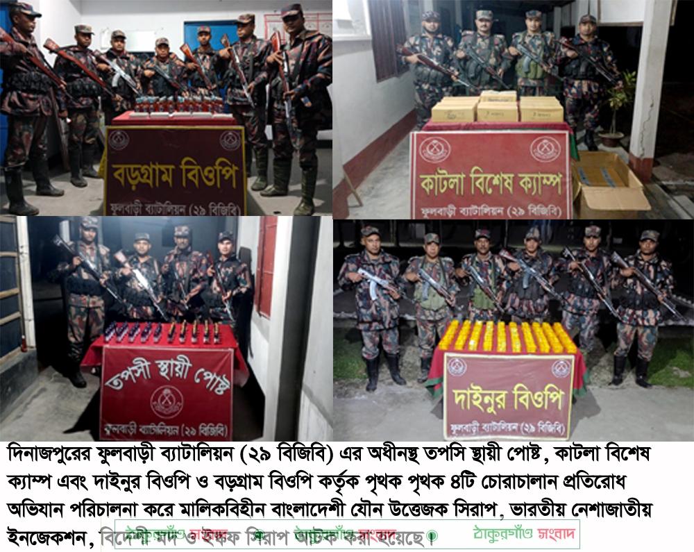 বিজিবি জানায়, ফুলবাড়ী ব্যাটালিয়ন (২৯ বিজিবি) এর অধীনস্থ তপসি স্থায়ী পোষ্ট, কাটলা বিশেষ ক্যাম্প ও দাইনুর বিওপি কর্তৃক ৩টি চোরাচালান প্রতিরোধ অভিযান পরিচালনা করে মালিকবিহীন ২৪০ বোতল বাংলাদেশী যৌন উত্তেজক সিরাপ এবং ভারতীয় ১হাজার পিস নেশাজাতীয় ইনজেকশন এবং ৫৩ বোতল ইস্কাফ সিরাপ জব্দ করা হয়। এছাড়াও বৃহস্পতিবার (১৩ নভেম্বর) বড়গ্রাম বিওপি কর্তৃক ১টি চোরাচালান প্রতিরোধ অভিযান পরিচালনা করে ৯৬ বোতল বিদেশী মদ এবং ৯৩ পিস ভারতীয় নেশাজাতীয় ইনজেকশন আটক করতে সক্ষম হয়। উদ্ধারকৃত মাদকদ্রব্য ও চোরাচালানী মালামালের মোট সিজার মূল্য ৩ লাখ ৬৫ হাজার ১৫০ টাকা।