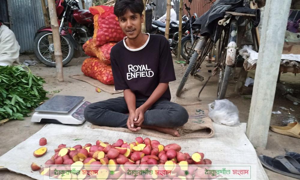 হাটের অন্য পাশে বিক্রেতারা গলা চড়িয়ে ক্রেতা ডাকছেন, ‘কাটা আলু, কেজি ১০ টাকা! ভালো আলু, নিয়ে যান’। দেখতে সাধারণ আলুর মতো হলেও এগুলো হিমাগারের এলুয়েট বা এস্টারিক্স বীজ আলু, যেগুলোর নষ্ট অংশ ফেলে দিয়ে ভালো অংশ কেটে আলাদা করা হয়েছে।