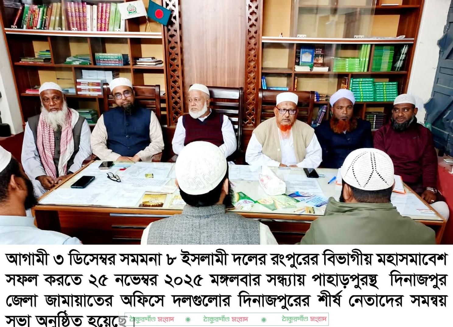 আগামী ৩ ডিসেম্বর সমমনা ৮ ইসলামী দলের রংপুরের বিভাগীয় মহাসমাবেশ সফল করতে দলগুলোর দিনাজপুরের শীর্ষ নেতাদের সমন্বয় সভা অনুষ্ঠিত হয়েছে। ২৫ নভেম্বর ২০২৫ মঙ্গলবার সন্ধ্যায় পাহাড়পুরস্থ দিনাজপুর জেলা জামায়াতে ইসলামী কার্যালয়ে এ সভা অনুষ্ঠিত হয়।