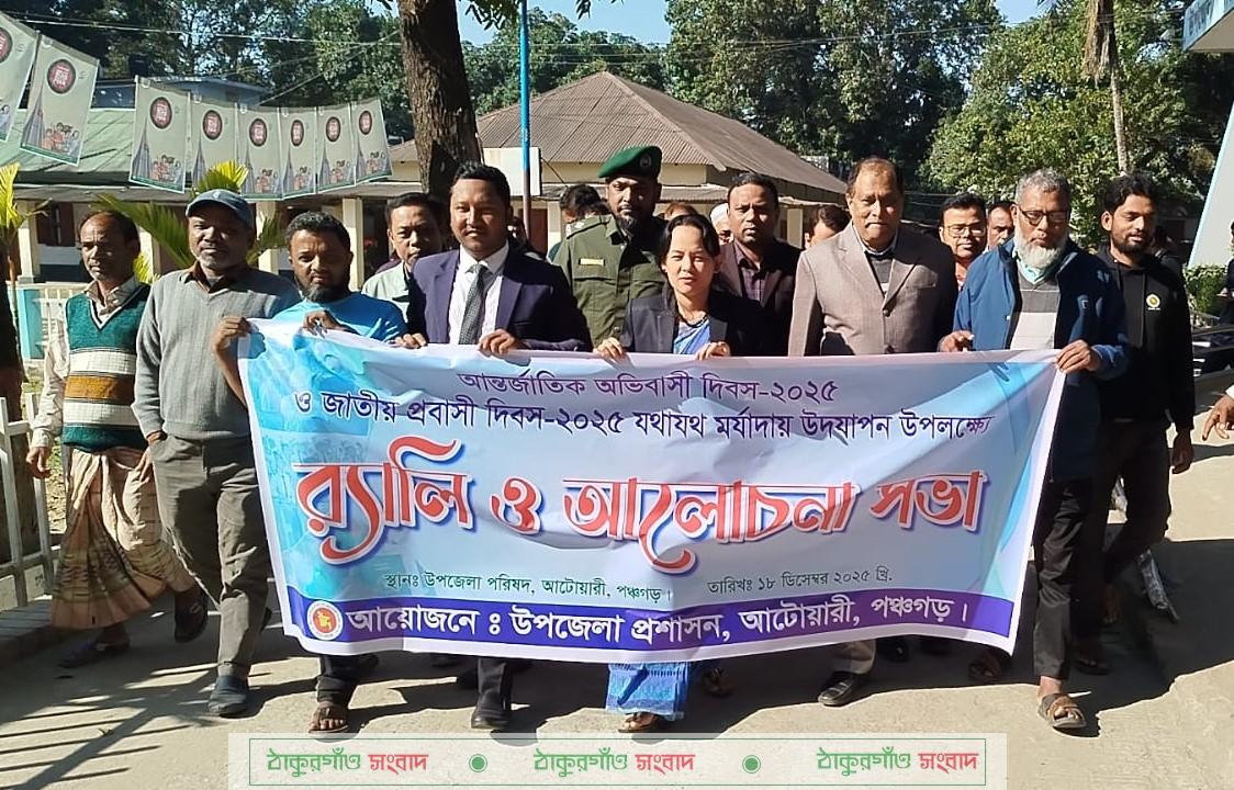 “দক্ষতা নিয়ে যাব বিদেশ, রেমিট্যান্স দিয়ে গড়বো স্বদেশ” শ্লোগানকে সামনে রেখে পঞ্চগড়ের আটোয়ারীতে আন্তর্জাতিক অভিবাসী দিবস ও জাতীয় প্রবাসী দিবস-২০২৫ উপলক্ষে র্যালী এবং আলোচনা সভা আয়োজনের মধ্য দিয়ে দিবসদ্বয় পালন করেছে আটোয়ারী উপজেলা প্রশাসন। বৃহস্পতিবার (১৮ ডিসেম্বর) সকালে নবাগত আটোয়ারী উপজেলা নির্বাহী অফিসার (ইউএনও) রিপামনি দেবী’র নেতৃত্বে র্যালী শেষে তার সভাপতিত্বে পরিষদের সম্মেলন কক্ষে আলোচনা সভা অনুষ্ঠিত হয়। কারিগরি প্রশিক্ষণ কেন্দ্র (টিটিসি) পঞ্চগড়ের সিভিল ইনস্ট্রাকটর সনাতন চন্দ্র বর্মনের সঞ্চালনায় আয়োজিত আলোচনা সভায় অন্যান্যের মধ্যে আরো উপস্থিত থেকে বক্তব্য রাখেন উপজেলা প্রাথমিক শিক্ষা অফিসার মোঃ মাসুদ হাসান, সমাজ সেবা অফিসার (অ:দা:) মোঃ আবু তাহের, নির্বাচন অফিসার মোঃ শাহজাহান মানিক, আনসার ভি.ডি.বি কর্মকর্তা মোঃ সানোয়ারুল আলম, সহকারী যুব উন্নয়ন কর্মকর্তা সহিদুর রহমান মানিক, আইসিটি কর্মকর্তা মোঃ আরিফুল ইসলাম, প্রবাসী কল্যান ব্যাংকের একাউন্টেন্ট মোঃ জালাল উদ্দীন, আটোয়ারী প্রেসক্লাবের সাধারণ সম্পাদক মনোজ রায় হিরু ও আটোয়ারী উপজেলা প্রেসক্লাবের সভাপতি মোঃ ইউসুফ আলী সহ বিভিন্ন দপ্তরের প্রতিনিধিগণ।