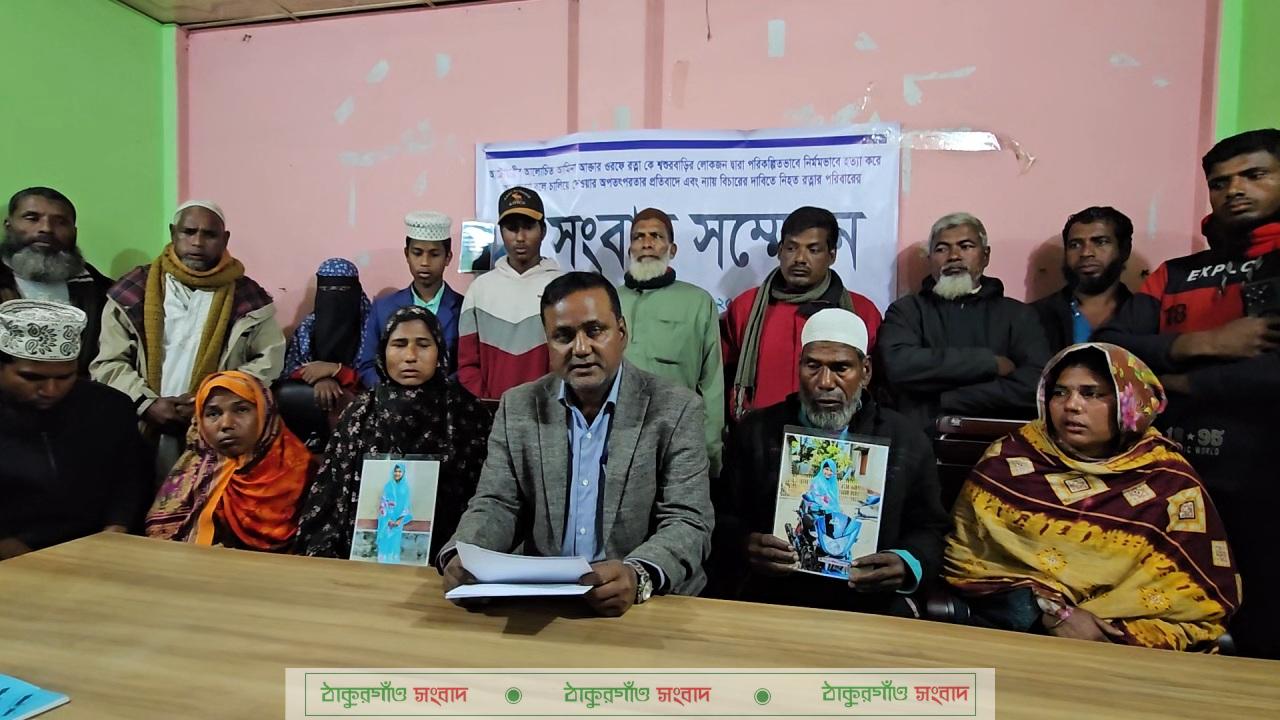 সংবাদ সম্মেলনে তারা জানান, তাদের মেয়ে আমিনা আক্তার রতœাকে ২০২৩ সালে বিয়ে দেন পার্শ্ববর্তী বাকডোকরা এলাকার ফারাজুল ইসলামের ছেলে রবিউল ইসলামের সাথে। তাদের সংসারে ৭ মাসের একটি কন্যা সন্তান রয়েছে। গত ২২ নভেম্বরে রাতে আশঙ্কাজনক অবস্থায় রতœাকে স্বামী ও শ্বশুর বাড়ির লোকজন আটোয়ারী উপজেলা স্বাস্থ্য কমপ্লেক্সে নিয়ে গেলে সেখানেই তার মৃত্যু হয়। সকালে তারা ওই গৃহবধুর পরিবারকে জানায় বিষপানে আত্মহত্যা করেছে রতœা। কিন্তু ওই গৃহবধুর পরিবারের লোকজন গিয়ে তার শরীরের বিভিন্ন স্থানে আঘাতের চিহ্ন দেখতে পান। এমনকি বিষের কোন আলামতও পাননি তারা। তাদের দাবি হত্যা করে নাটক সাজানো হয়েছে। এ ঘটনায় প্রথমে তারা আপোষের প্রস্তাব দিলেও তা প্রত্যাখান করে ২৪ নভেম্বর আটোয়ারী থানায় মামলা করে ভুক্তভোগী পরিবার। মামলা চলমান অবস্থায় সম্প্রতি আসামীপক্ষ থেকে টাকার বিনিময়ে ময়নাতদন্তের প্রতিবেদন বদলানোসহ নানা হুমকি ধামকি দেয়া হচ্ছে বলে অভিযোগ করেন ওই গৃহবধূর বাবা আমির উদ্দিন। তিনি বলেন, আমার মেয়েকে মারপিট করে হত্যার পর ওরা আত্মহত্যার নাটক সাজিয়েছে তারা। এখন তারা ময়নাতদন্তের প্রতিবেদন টাকার বিনিময়ে পাল্টে দেয়ার হুমকি দিচ্ছেন। ওরা প্রভাবশালী হওয়ায় আমাদের হুমকি ধামকি দিচ্ছে। প্রধান আসামী এখনো গ্রেপ্তার হয়নি। আমি আমার মেয়েকে হত্যার সাথে যারা জড়িত তাদের গ্রেপ্তার করে দৃষ্টান্তমূলক শাস্তি চাই। নিহত রতœার মা নারগিস আক্তার, চাচা ওমর আলী ও বোন আরজিনা আক্তারসহ এলাকাবাসী উপস্থিত ছিলেন।