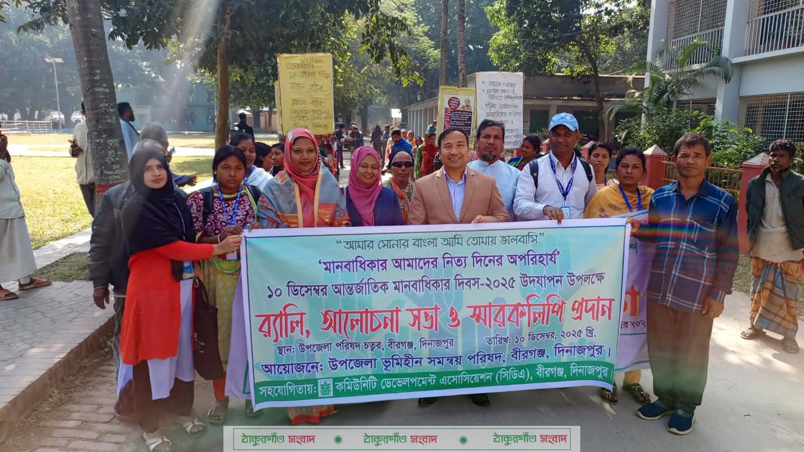 বীরগঞ্জ উপজেলা কমিউনিটি ডেভেলপমেন্ট এসোসিয়েশন (সিডিএ) এর উপজেলা ভূমিহীন সমন্বয় পরিষদের সভাপ্রধান বিনয় চন্দ্র রায়ের সভাপতিত্বে ও ইএসডিও থ্রাইড প্রকল্পের প্রজেক্ট অফিসার অরুন চন্দ্র শীলের সঞ্চালনায় প্রধান অতিথি’র বক্তব্য রাখেন উপজেলা সহকারী কমিশনার (ভূমি) দীপংকর বর্মন। বিশেষ অতিথির বক্তব্য রাখেন উপজেলা প্রাথমিক শিক্ষা অফিসার মোছাঃ শাহজিদা হক। এসময় গ্রাম সহায়ক মো: আমিনুল ইসলাম, নরেন চন্দ্র দাস,জেলা ভূমিহীন সমন্বয়কারীর সদস্য রূপালী রানী সরকার নিশি কান্ত বর্মন, জন সংগঠনের সদস্য সারগর চন্দ্র রায়, ভোগনগর ইউনিয়ন ভূমি সমন্বয়ক পরিষদের সভাপ্রধান আব্দুল হামিদ,ইএসডিও থ্রাইড প্রকল্পের অংশগ্রহণকারী হাসিনা মুর্মু,শান্তনা বাসকে উপস্থিত ছিলেন। বক্তারা বলেন, মানবাধিকার রক্ষা রাষ্ট্রের উন্নয়ন, সামাজিক স্থিতি এবং ব্যক্তির নিরাপত্তার মূলভিত্তি। মানুষের মৌলিক অধিকার নিশ্চিত করতে সচেতনতা বৃদ্ধি, আইনের শাসন প্রতিষ্ঠা ও মানবিক মূল্যবোধ চর্চার ওপর গুরুত্বারোপ করেন তারা। আমাদের সমাজ কাঠামো আগে ঠিক করতে হবে। আমাদের সমাজ কাঠামো ঠিক করার সর্বোচ্চ চেষ্টা চালাতে হবে। বিশ্বে নিরাপত্তাহীনতা, বিচার বহির্ভূত হত্যাকান্ড ও গুমের মত ঘটনার কারণে আজ মানবাধিকার যে সাফল্য অর্জন করেছে তা ম্লান হয়ে যাচ্ছে। আমাদের প্রত্যেককে এই বিষয়ে সচেতন ও সোচ্চার হওয়ার উচিত। আলোচনা সভা শেষে বীরগঞ্জ নির্বাহী অফিসারের মাধ্যমে প্রধান উপদেষ্টার বারবারে একটি স্মারক লিপি প্রদান করা হয়।