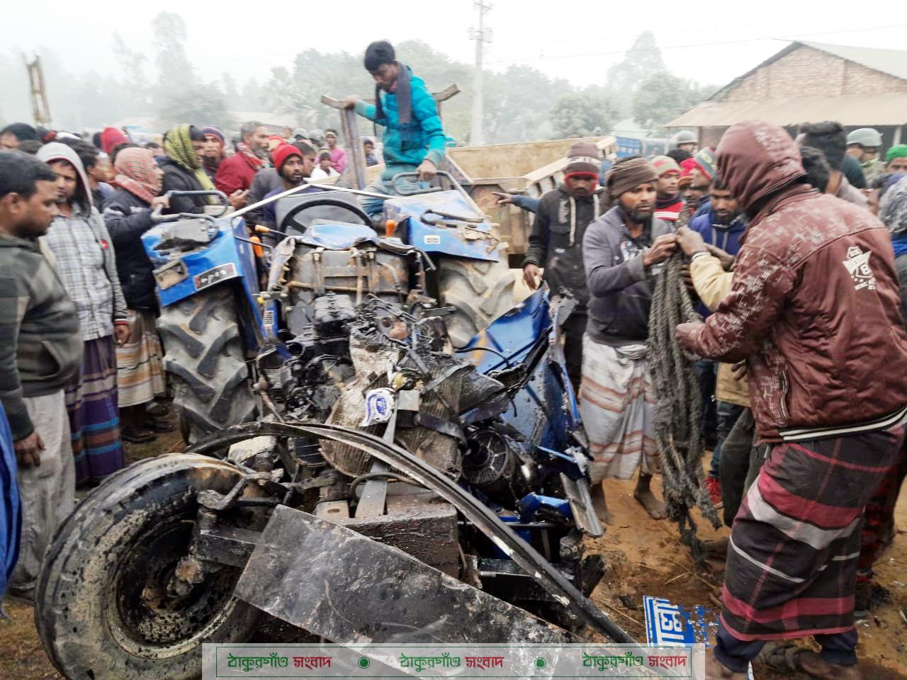 পুলিশ ও স্থানীয়রা জানায়, দিনাজপুর থেকে ঢাকাগামী মোল্লা পরিবহের একটি বাসের সাথে ট্রাক্টরের মুখোমুখি সংঘর্ষের ঘটনা ঘটেছে। এতে ট্রাক্টরটি দুমড়েমুচড়ে যায় এবং ট্রাক্টর চালকের ঘটনাস্থলে মৃত্যু হয়। দুর্ঘটনায় গুরুতর আহত অপর একজনকে স্থানীয়রা উদ্ধার করে উপজেলা স্বাস্থ্য কমপ্লেক্স নিয়ে গেলে কর্তব্যরত চিকিৎসক ওই ব্যক্তিকে মৃত ঘোষণা করেন।