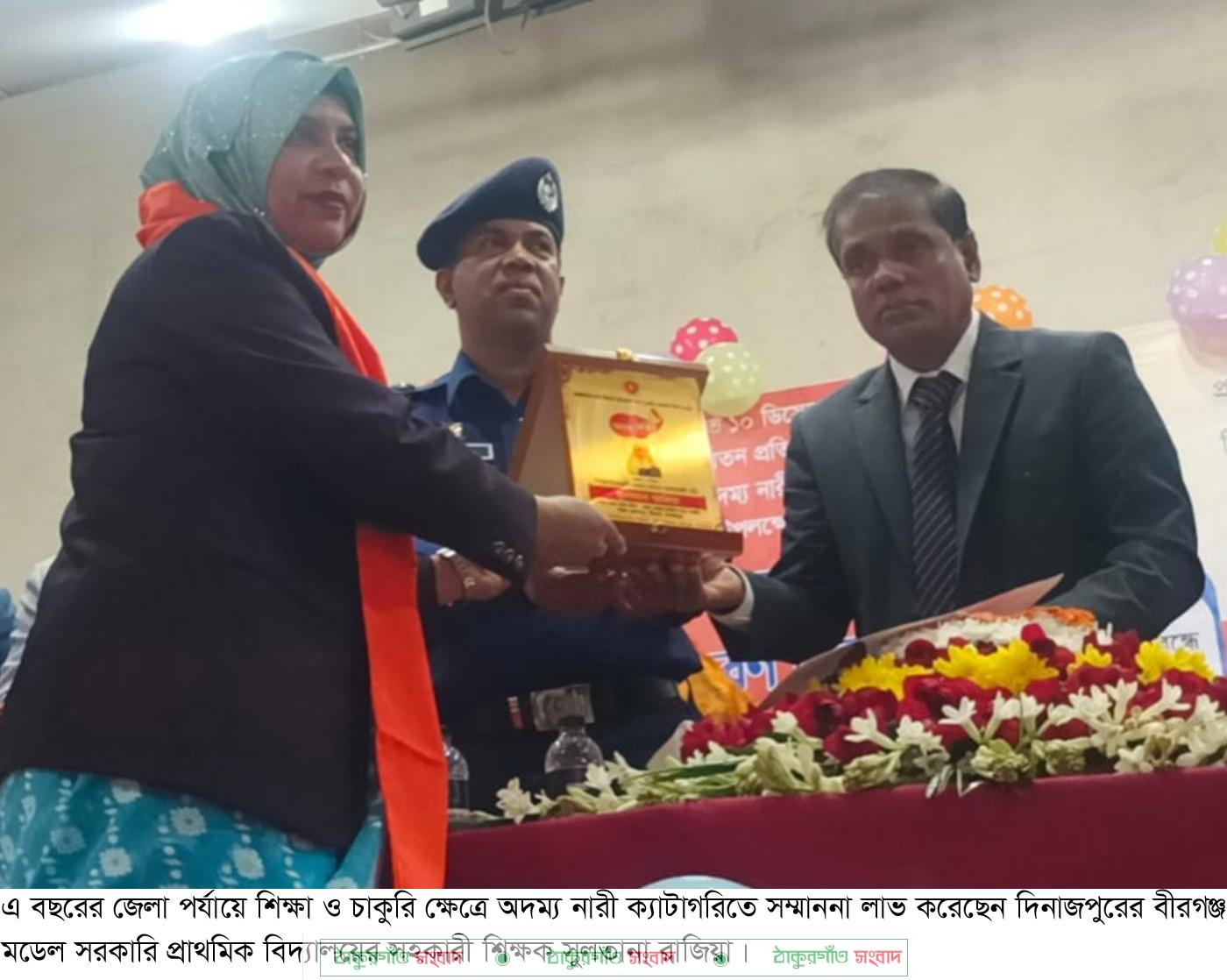 বীরগঞ্জ (দিনাজপুর) প্রতিনিধি \ আন্তর্জাতিক নারী নির্যাতন প্রতিরোধ পক্ষ ও বেগম রোকেয়া দিবস ২০২৫ উপলক্ষে দিনাজপুর জেলা প্রশাসন ও মহিলা বিষয়ক অধিদপ্তর দিনাজপুরের আয়োজনে দেওয়া হলো সম্মানজনক “অদম্য নারী সম্মাননা ২০২৫”। এ বছরের জেলা পর্যায়ে শিক্ষা ও চাকুরি ক্ষেত্রে অদম্য নারী ক্যাটাগরিতে সম্মাননা লাভ করেছেন বীরগঞ্জ মডেল সরকারি প্রাথমিক বিদ্যালয়ের সহকারী শিক্ষক সুলতানা রাজিয়া।