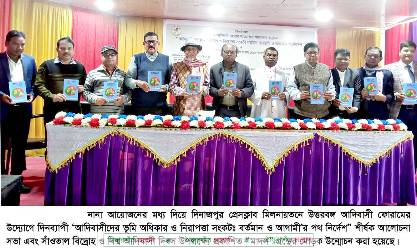 শনিবার রাতে নানা আয়োজনের মধ্য দিয়ে দিনাজপুর প্রেসক্লাব মিলনায়তনে উত্তরবঙ্গ আদিবাসী ফোরামের উদ্যোগে দিনব্যাপী ‘আদিবাসীদের ভ‚মি অধিকার ও নিরাপত্তা সংকটঃ বর্তমান ও আগামী’র পথ নির্দেশ” শীর্ষক আলোচনা সভা এবং সাঁওতাল বিদ্রোহ ও বিশ্ব আদিবাসী দিবস উপলক্ষ্যে প্রকাশিত “মাদল” গ্রন্থের মোড়ক উন্মোচন করা হয়েছে।