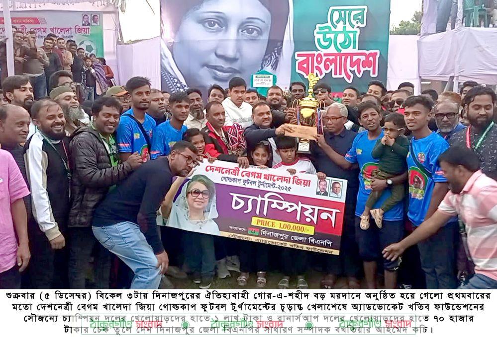 দিনাজপুরে দেশনেত্রী বেগম খালেদা জিয়া গোল্ডকাপ ফুটবল টুর্নামেন্ট-২০২৫ এর চ‚ড়ান্ত খেলা অনুষ্ঠিত হয়েছে। জেলা বিএনপি আয়োজিত প্রথমবারের মতো এই টুর্ণামেন্টে রাজশাহীর কিশোর ফুটবল একাডেমীকে ৩-১ গোলে হারিয়ে চ্যাম্পিয়ন হওয়ার গৌরব অর্জন করেছে সৈয়দপুরের আনন্দমিহির স্পোটিং ক্লাব।