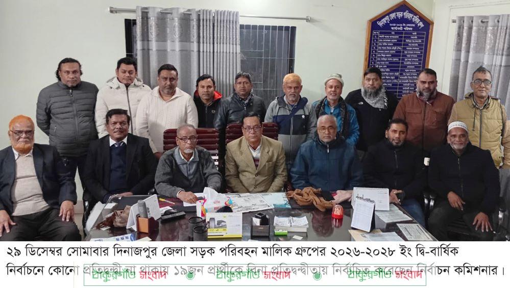 প্রধান নির্বাচন কমিশনার এ্যাডঃ আশফাক আহম্মেদ, নির্বাচন বোর্ডেরর সদস্য এ্যাডঃ ইকবাল রায়হান সোহেল ও এ্যাড সুবাস চন্দ্র রায় জানান আজ ২৯-১২-২০২৫ রোজ সোমবার দিনাজপুর জেলা সড়ক পরিবহন মালিক গ্রæপের দ্বি-বার্ষিক নির্বাচন ২০২৬-২০২৮ ইং মনোনয়নপত্র দাখিল এবং বাছাই এর জন্য দিন ধার্য ছিল। কিন্তু প্রতিটি পদে নিদিষ্ট সংখ্যাক মনোনয়ন পত্র পাওয়ায় এবং প্রতিদ্ব›দ্বী প্রার্থী না থাকায় ১৯ জন প্রার্থীকে বিনাপ্রতিদ্ব›দ্বীতায় নির্বাচিত ঘোষনা করা হলো। তারা হলেন সভপতি পদে ভবানী শংকর আগরওয়ালা, সিনিয়র সহ-সভাপতি তোফাজ্জল হোসেন, সহ-সভাপতি শামীম আজাদ, সাধারণ সম্পাদক পদে শাহেদ রিয়াজ, যুগ্ম সাধারণ সম্পাদক কাজী মামুনুর রশিদ কচি, দপ্তর সম্পাদক জিল্লুর রহমান, যুগ্ম দপ্তর সম্পাদক অজয় কুমার আগরওয়ালা, সাংগঠনিক সম্পাদক আহম্মদ শাহ, কোষাধ্যক্ষ সুবল ঘোষ, সড়ক সম্পাদক শাহ মাসুদ কবীর, সহ-সড়ক সম্পাদক মোঃ আবুল কালাম আজাদ, আভ্যন্তরীন হিসাব নিরীক্ষক এ এফ এম আশিকুর রহমান চৌধুরী, যুগ্ম আভ্যন্তরীণ হিসাব নিরীক্ষক আরাফাত হোসেন, সদস্য এম এ খালেক, মোঃ গোলাম আজম, মোঃ রেজাউল করিম, মোঃ আরিফুল আলম, মোঃ জিল্লুর রহমান ও সুবিনয় রায়।