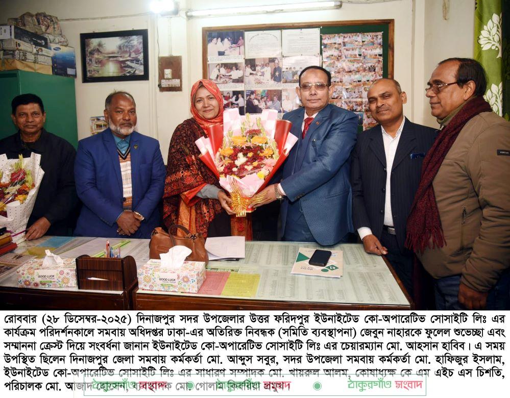 সমবায় অধিদপ্তর ঢাকা-এর অতিরিক্ত নিবন্ধক (সমিতি ব্যবস্থাপনা) জেবুন নাহার দিনাজপুর সদর উপজেলার ইউনাইটেড কো-অপারেটিভ সোসাইটি লিঃ এর কার্যক্রম পরিদর্শন করলেন।