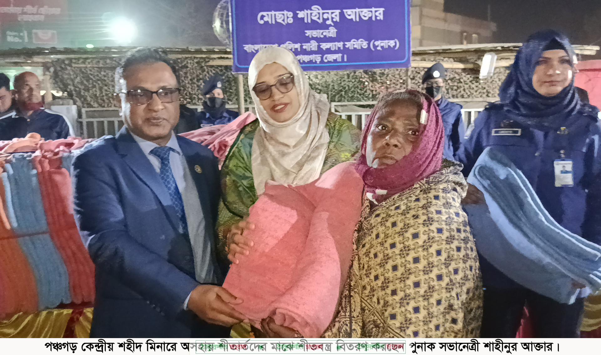 পঞ্চগড়ে অসহায়, দরিদ্র, ও খেটে খাওয়া শীতার্ত মানুষের পাশে দাড়িয়েছে বাংলাদেশ পুলিশ নারী কল্যাণ সমিতি (পুনাক) পঞ্চগড় জেলা শাখা। গত শনিবার রাতে পঞ্চগড়ে কেন্দ্রীয় শহীদ মিনারে এসব শীতার্তদের মাঝে শীতবস্ত্র হিসেবে কম্বল বিতরণ করেন জেলা পুনাক সভানেত্রী শাহিনুর আক্তার। এ সময় পঞ্চগড়ের পুলিশ সুপার রবিউল ইসলাম, সদর থানার ভারপ্রাপ্ত কর্মকর্তা (ওসি) আশরাফুল ইসলাম, পুলিশ পরিদর্শক (তদন্ত) আশীষ কুমার শীল, সেকেন্ড অফিসার কাইয়ুম আলী প্রমুখ।