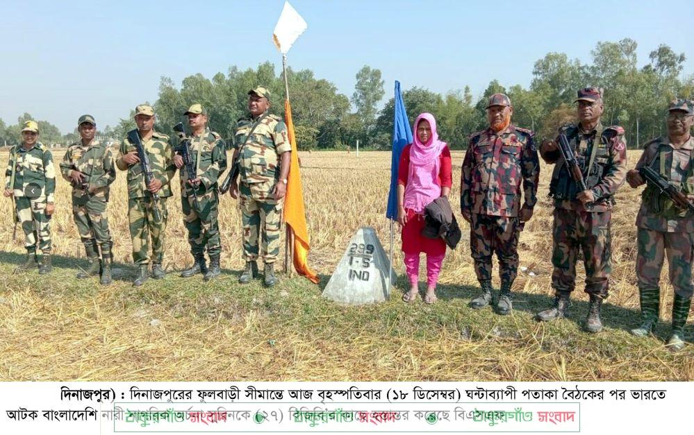 বর্ডার গার্ড বাংলাদেশ-বিজিবি ফুলবাড়ী ২৯ ব্যাটালিয়ন এর প্রেসবিজ্ঞপ্তি সূত্রে জানা যায়, অনুপ্রেবেশের দায়ে ভারতে আটক বাংলাদেশি নাগরিক অর্চনা সুরিনকে ফেরতের জন্য ৫৭ ব্যাটালিয়ন বিএসএফ এর মাধবপুর কোম্পানী কমান্ডারের আহবানে ফুলবাড়ী ২৯ ব্যাটালিয়নের অধিনে রসুলপুর বিওপি’র দায়িত্বপূর্ণ এলাকার সীমান্ত পিলার ২৯৯/১ এস এর কাছে ভারতের অভ্যন্তরে বসুলপুর শেখপাড়া (জিআর-৮২৫০৯৭, এমএস-৭৮ সি/১৪) নামক স্থানে আমড়া কোম্পানী কমান্ডারের সাথে আজ বৃহস্পতিবার (১৮ ডিসেম্বর) সকাল সাড়ে ১০ থেকে সাড়ে ১১ টা পর্যন্ত ঘন্টাব্যাপী পতাকা বৈঠক অনুষ্ঠিত হয়।