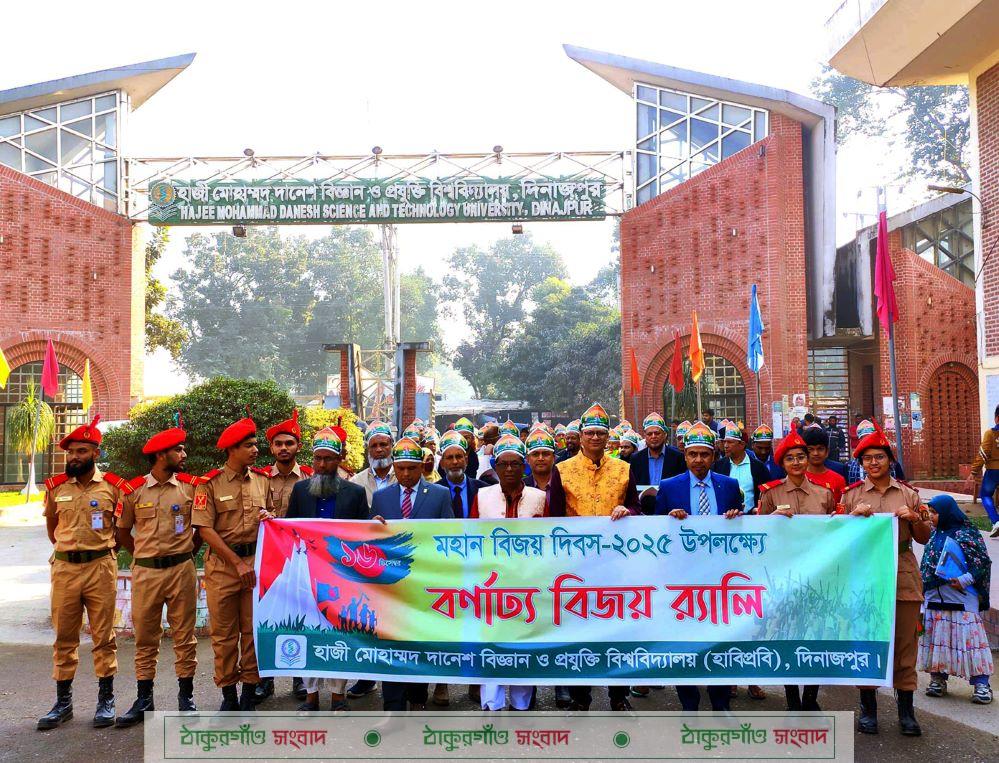 যথাযোগ্য মর্যাদা, উৎসাহ ও উদ্দীপনার মধ্য দিয়ে হাজী মোহাম্মদ দানেশ বিজ্ঞান ও প্রযুক্তি বিশ্ববিদ্যালয়ে (হাবিপ্রবি) মহান বিজয় দিবস-২০২৫ উদযাপিত হয়েছে। দিবসটি উদযাপনের লক্ষ্যে বিশ্ববিদ্যালয়ের পক্ষ হতে বিভিন্ন কর্মস‚চি গ্রহণ করা হয়। কর্মস‚চির অংশ হিসেবে স‚র্যোদয়ের সাথে সাথে সকাল ৬.৪৫ টায় প্রশাসনিক ভবনের সন্মুখে জাতীয় পতাকা উত্তোলন করা হয়। অতঃপর সকাল ৯.০৫ টায় হাবিপ্রবির মাননীয় ভাইস-চ্যান্সেলর প্রফেসর ড. মো. এনামউল্যা এর নেতৃত্বে এবং প্রোভাইস-চ্যান্সেলর প্রফেসর ড. মো. শফিকুল ইসলাম সিকদার ও ট্রেজারার প্রফেসর ড. এম. জাহাঙ্গীর কবির-এর উপস্থিতিতে বিজয় দিবসের বর্ণাঢ্য র্যালিটি এসসির সম্মুখ হতে শুরু হয়ে পুরো ক্যাম্পাস ও এর সামনের মহাসড়ক প্রদক্ষিণ করে। র্যালিতে বিপুল সংখ্যক শিক্ষার্থী, শিক্ষক, কর্মকর্তা ও কর্মচারী অংশ গ্রহণ করেন। এরপর সকাল ৯.৩০ টায় বিশ্ববিদ্যালয় প্রশাসনের পক্ষ থেকে মাননীয় ভাইস-চ্যান্সেলর ভাইস-চ্যান্সেলর প্রফেসর ড. মো. এনামউল্যা, প্রোভাইস-চ্যান্সেলর প্রফেসর ড. মো.শফিকুল ইসলাম সিকদার, ট্রেজারার প্রফেসর ড. এম. জাহাঙ্গীর কবির, রেজিস্ট্রার প্রফেসর ড. মো. আবু হাসান, প্রক্টর প্রফেসর ড. মো. শামসুজ্জোহা, ছাত্র পরামর্শ ও নির্দেশনা বিভাগের পরিচালক প্রফেসর ড. এস. এম. এমদাদুল হাসান সকল শহিদগণের স্মৃতির প্রতি শ্রদ্ধা জ্ঞাপনের লক্ষ্যে শহিদ মিনারে পুষ্পস্তবক অর্পণ করেন। ক্রমান্বয়ে বিভিন্ন অনুষদের ডীন, হল সুপার, পরিচালকবৃন্দ এবং শিক্ষক, কর্মকর্তা, কর্মচারী ও শিক্ষার্থীদের বিভিন্ন সংগঠনের পক্ষ থেকে শহিদগণের স্মৃতির প্রতি শ্রদ্ধা জ্ঞাপনের জন্য শহিদ মিনারে পুষ্পস্তবক অর্পণ করা হয়।