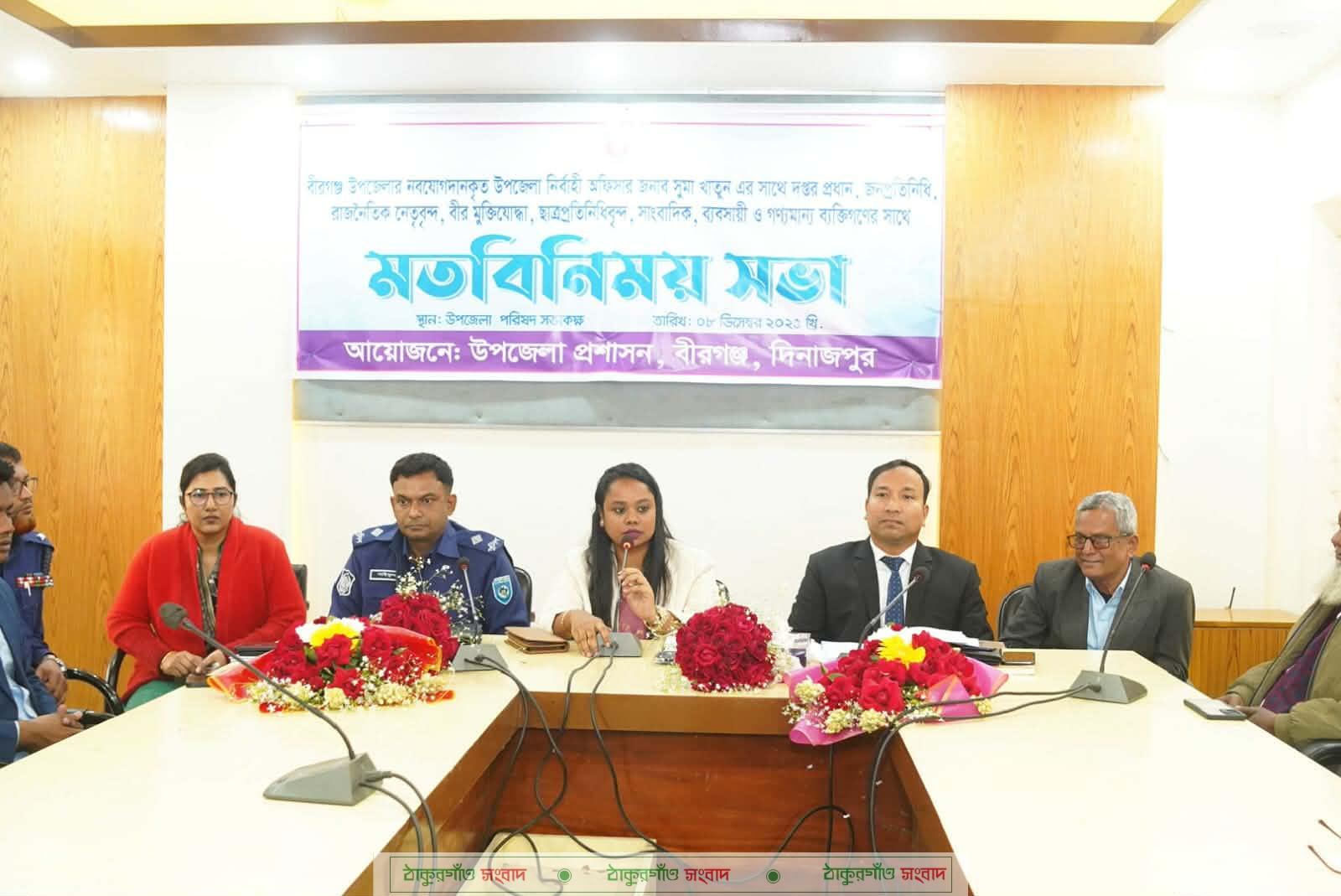 সোমবার (৮ ডিসেম্বর) বেলা ১১টায় উপজেলা পরিষদ সভাকক্ষে মতবিনিময় সভায় উপজেলার বিভিন্ন সমস্যা সহ আইনশৃঙ্খলা নিয়ন্ত্রণে বিষদ আলোচনা তুলে ধরা হয়। মতবিনিময় সভায় উপস্থিত ছিলেন উপজেলা সহকারী কমিশনার (ভুমি) দীপঙ্কর বর্মন , বীরগঞ্জ থানার নবাগত অফিসার ইনচার্জ মোঃ সাইফুল ইসলাম, দিনাজপুর জেলা মুক্তিযোদ্ধা কমান্ডের যুগ্ম আহ্বায়ক বীর মুক্তিযোদ্ধা মোঃ কবিরুল ইসলাম,উপজেলা স্বাস্থ্য ও পরিবার পরিকল্পনা কর্মকর্তা . আফরোজ সুলতানা,উপজেলা প্রকৌশলী হুমায়ুন কবীর,উপজেলা সমাজ সেবা অফিসার মো: তরিকুল ইসলাম, মহিলা বিষয়ক অফিসার নিবেদিতা দাস,পুলিশ পরিদর্শক তদন্ত, জনাব মোহাম্মদ শিহাব উদ্দীন,উপজেলা জামায়াতের আমির ক্বারী আজিজুর রহমান,জেলা শ্রমিক কল্যাণ ফেডারেশনের সহ-সভাপতি রাশেদুন্নবী বাবুসহ বীর মুক্তিযোদ্ধা, সরকারি কর্মকর্তা, রাজনৈতিক ব্যাক্তি,জনপ্রতিনিধি, শিক্ষক, ছাত্র প্রতিনিধি, সাংবাদিকসহ বিভিন্ন শ্রেণি-পেশার মানুষ।