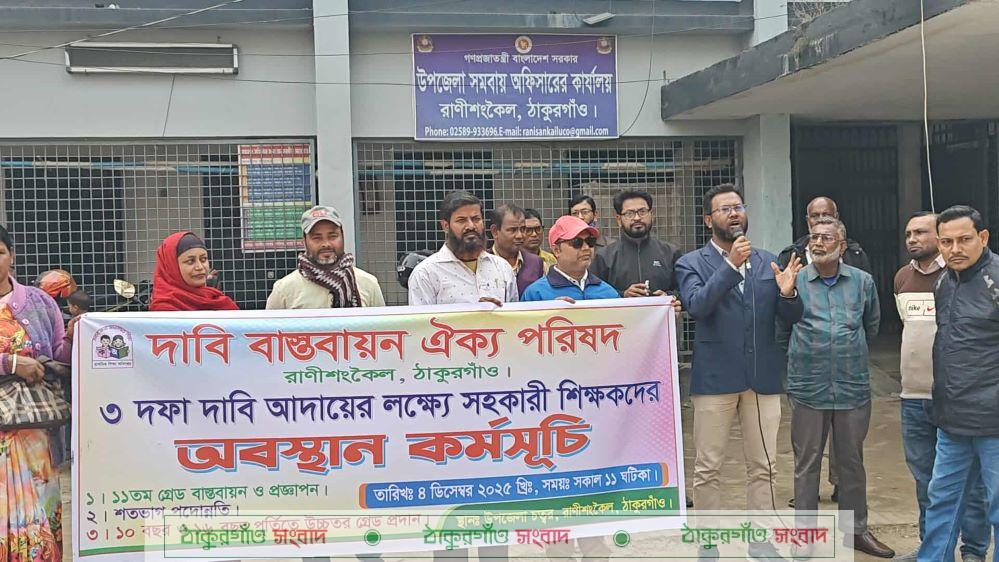 রাণীশংকৈল(ঠাকুরগাঁও)প্রতিনিধি\ সহকারী শিক্ষকদের কর্মবিরতির মাঝেও প্রধান শিক্ষকের একক উদ্যোগে সামান্য কিছু বিদ্যালয়ে বার্ষিক পরীক্ষা অনুষ্ঠিত হয়। ৪ডিসেম্বর বৃহস্পতিবার রাণীশংকৈল উপজেলা চত্বরে সকাল ১১টায় সরকারি প্রাথমিক বিদ্যালয়ের সহকারী শিক্ষকদের তিন দফা দাবি আদায়ে লক্ষে অবস্থান কর্মসূচী পালন করেছে। বৃহস্পতিবার সরকারি প্রাথমিক বিদ্যালয় গুলোতে সরেজমিনে গিয়ে দেখা যায়, সহকারী শিক্ষকরা কর্মবিরতি পালন করলেও কিছু বিদ্যালয়ের প্রধান শিক্ষক একাই পরীক্ষা চালিয়ে যাচ্ছেন। সহকারী শিক্ষকদের অনুপস্থিতিতে পরীক্ষা নিতে গিয়ে নানা চ্যালেঞ্জের মুখোমুখিন হতে হচ্ছে বলেও প্রধান শিক্ষকগণ উল্লেখ করেন। উল্লেখ্য, সহকারী শিক্ষকদের বেতন স্কেল ১০ম গ্রেডে উন্নীতকরণ, ১০ ও ১৬ বছর প‚র্তিতে উচ্চতর গ্রেড প্রাপ্তির জটিলতা নিরসন, সহকারী শিক্ষক থেকে প্রধান শিক্ষক পদে শতভাগ বিভাগীয় পদোন্নতি নিশ্চিতকরণ এ তিন দফা দাবির প্রেক্ষিতে গত কয়েকদিন ধরে সারাদেশের প্রাথমিক বিদ্যালয়গুলোতে সহকারী শিক্ষকরা কর্মবিরতি পালন করছেন।