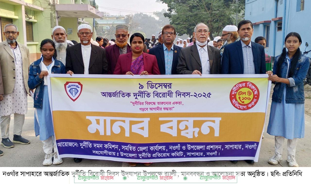 প্রদীপ কুমার সাহা,সাপাহার(নওগাঁ) প্রতিনিধি: “দুর্নীতির বিরুদ্ধে তারুণ্যের একতা, গড়বে আগামীর শুদ্ধতা” প্রতিপাদ্য বিষয়কে সামনের রেখে নওগাঁর সাপাহারে আন্তর্জাতিক দুর্নীতি বিরোধী দিবস উদ্যাপন উপলক্ষে র্যালী, মানববন্ধন ও আলোচনা সভা অনুষ্ঠিত হয়েছে।