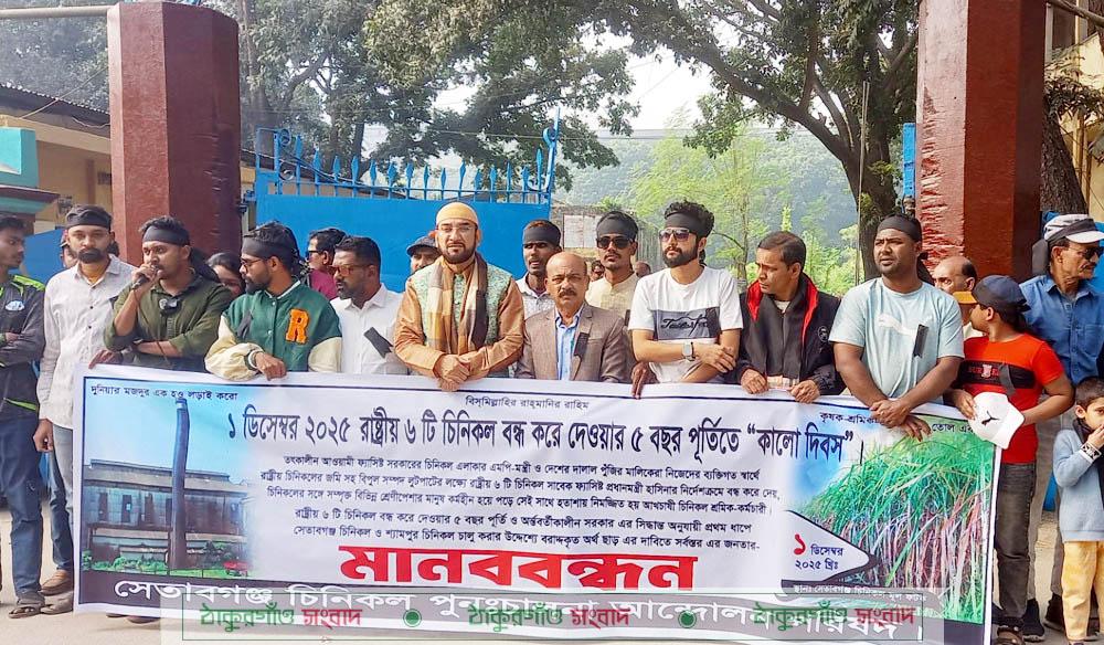 তাদের মধ্যে গভীর হতাশা জন্ম নেয়। রাষ্ট্রীয় সম্পদ লুটপাট বন্ধ ও জনগণের অধিকার রক্ষায় চিনিকল পুনরায় চালু করা এখন সময়ের দাবি। অন্তর্বতীকালীন সরকার দায়িত্ব নেওয়ার পর প্রথম ধাপে সেতাবগঞ্জ ও শ্যামপুর চিনিকল চালুর সিদ্ধান্ত এবং প্রয়োজনীয় অর্থ বরাদ্দ অনুমোদন করলেও এখন পর্যন্ত অর্থ ছাড় না হওয়ায় আন্দোলনকারীরা ক্ষোভ প্রকাশ করেন। তারা বলেন, ‘চিনিকল এলাকার মানুষ বহু বছর ধরে দুর্দশায় দিন কাটাচ্ছে।সরকারের সিদ্ধান্তের পরও অর্থ ছাড় না হওয়া অযৌক্তিক। অবিলম্বে বরাদ্দের অর্থ ছাড় দিতে হবে এবং দ্রæত চিনিকল চালুর কার্যক্রম শুরু করতে হবে।মানববন্ধনে কৃষক, শ্রমিক, শিক্ষক, শিক্ষার্থী, ব্যবসায়ী, পেশাজীবীসহ দলমত নির্বিশেষে স্থানীয়রা অংশ নেন।বক্তারা আরো বলেন, ২০২০ সালের ১ ডিসেম্বর তৎকালীন সরকারের রাষ্ট্রীয় শিল্পবিরোধী নীতি ও নির্দেশে ছয়টি চালু চিনিকল একযোগে আখ মাড়াই কার্যক্রম বন্ধ করে দেওয়া হয়, যা দেশের শিল্পখাতের জন্য বড় ধরনের ক্ষতি বয়ে আনে।