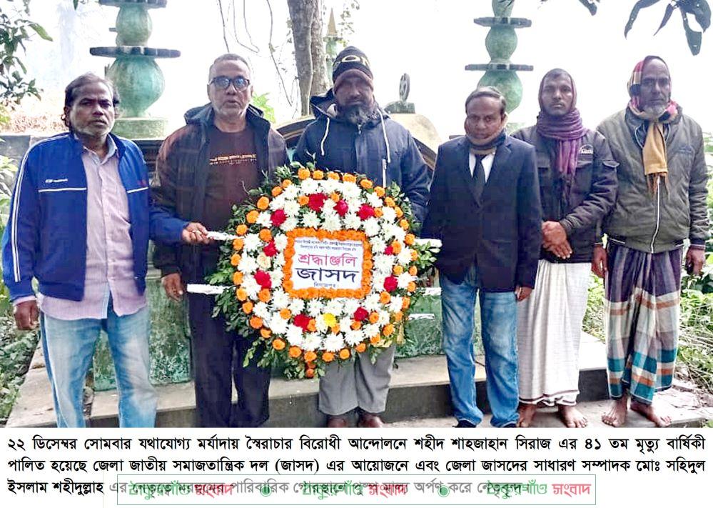 সোমবার যথাযোগ্য মর্যাদায় স্বৈরাচার বিরোধী আন্দোলনে শহীদ শাহজাহান সিরাজ এর ৪১ তম মৃত্যু বার্ষিকী পালিত হয়েছে জেলা জাতীয় সমাজতান্ত্রিক দল (জাসদ) এর আয়োজনে।