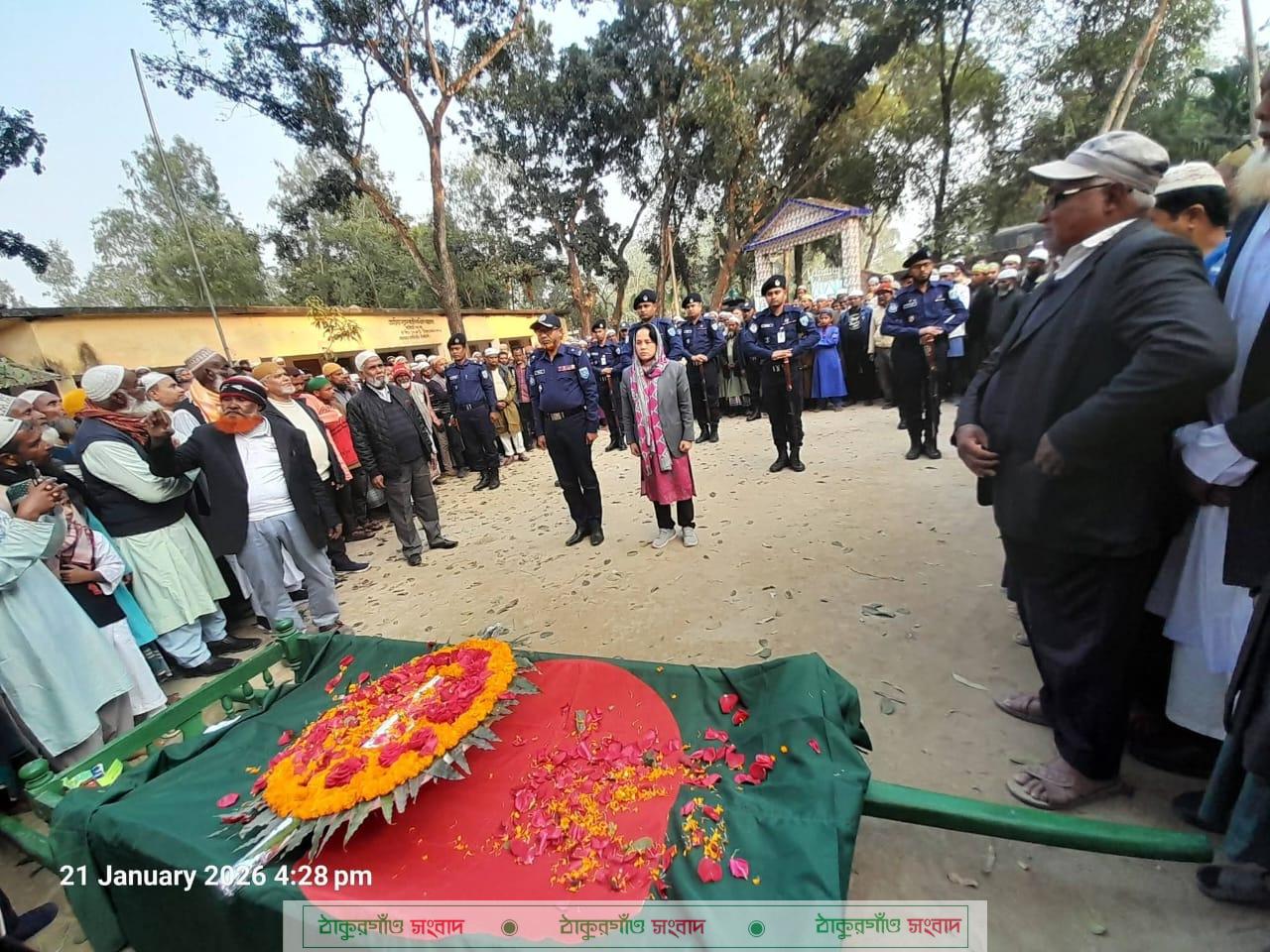 আটোয়ারী(পঞ্চগড়) প্রতিনিধি ঃ পঞ্চগড়ের আটোয়ারী উপজেলার ৩নং তোড়িয়া ইউনিয়নের মুন্সিপাড়া গ্রামের মৃত আলহাজ্ব ফইম উদ্দীনের পুত্র অবসরপ্রাপ্ত সেনা সদস্য ও বীর মুক্তিযোদ্ধা মোঃ দারাজ উদ্দীন(৭৭) মঙ্গলবার (২০ জানুয়ারি) দিবাগত গভীর রাতে হৃদযন্ত্রের ক্রিয়া বন্ধ হয়ে নিজ বাড়ীতে ইন্তেকাল করেন-( ইন্না লিল্লাহি ওয়া ইন্না ইলাইহি রাজিউন)। মৃত্যুকালে তিনি ৪ পুত্র, ১ কন্যা সন্তান,আত্মীয়স্বজন, বন্ধু-বান্ধবসহ অনেক গুনগ্রাহী রেখে গেছেন। বুধবার (২১ জানুয়ারি) বিকেলে তোড়িয়া নতুনহাট দাখিল মাদরাসা মাঠে রাস্ট্রের প্রতিনিধি হিসেবে উপজেলা নির্বাহী অফিসার রিপামনি দেবী উপস্থিত থেকে এবং আটোয়ারী থানার ওসি মোঃ মতিয়ার রহমান সহ চৌকশ একদল পুলিশ ফোর্সের অংশ গ্রহণে মৃত বীর মুক্তিযোদ্ধা দারাজ উদ্দীনকে রাস্ট্রীয় সম্মাননা হিসেবে গার্ড অব অনার প্রদান করা হয়। এর আগে জাতীয় পতাকায় বীর মুক্তিযোদ্ধা দারাজ উদ্দীনের মরদেহ ঢেকে দিয়ে রাস্ট্রের পক্ষ থেকে ও উপজেলা মুক্তিযোদ্ধা কমান্ডের পক্ষ থেকে ফুল দিয়ে শেষ শ্রদ্ধা জানানো হয়। পরে জানাযা শেষে পার্শ্ববর্তী পারিবারিক কবরস্থানে দাফন কার্য সম্পন্ন করা হয়। তার সেনাবাহিনী গেজেট নং ১৩২২৪, পরিচিতি নং ০১৭৭০০০০০৫০।