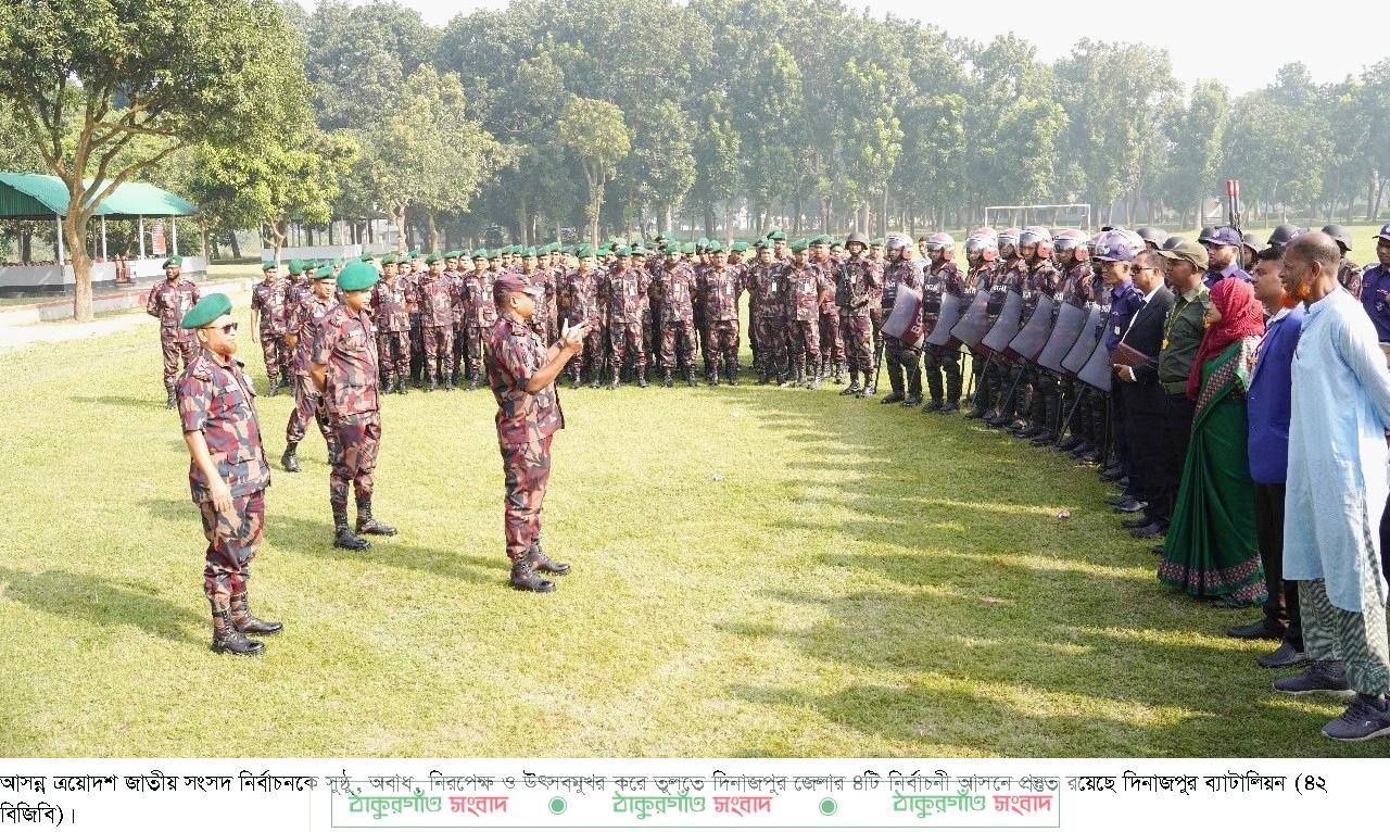 দিনাজপুর ব্যাটালিয়ন (৪২ বিজিবি)-এর অধিনায়ক লেঃ কর্নেল আব্দুল্লাহ আল মঈন হাসান জানান, “আসন্ন ত্রয়োদশ জাতীয় সংসদ নির্বাচনকে সুষ্ঠু, অবাধ, নিরপেক্ষ ও উৎসবমুখর করতে বর্ডার গার্ড বাংলাদেশ (বিজিবি) বদ্ধ পরিকর। সকল ভোটার যেন নিরাপদ ও শান্তিপূর্ণ পরিবেশে ভোটাধিকার প্রয়োগ করতে পারেন, সে লক্ষ্যে বিজিবি সর্বোচ্চ পেশাদারিত্বের সাথে দায়িত্ব পালন করবে।”