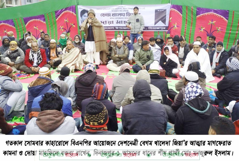 কাহারোল (দিনাজপুর) প্রতিনিধি ঃ দিনাজপুরের কাহারোলে বাংলাদেশ জাতীয়তাবাদী দলের চেয়ারপার্সন, সাবেক প্রধানমন্ত্রী, আপোষহীন নেত্রী, দিনাজপুরের কণ্যা দেশনেত্রী বেগম খালেদা জিয়ার আত্মার মাগফেরাত কামনায় দোয়া ও মাহফিল অনুষ্ঠিত হয়েছে। গতকাল সোমবার বিকাল পৌনে ৫টার দিকে উপজেলা সদরের মরহুম নাসির উদ্দীন চেয়ারম্যানের হাসকিং মিলের চাতালে উপজেলা বিএনপির আয়োজনে এই দোয়া মাহফিলের আয়োজন করা হয়। দোয়া ও মাহফিলে পূর্বে দেশনেত্রী বেগম খালেদা জিয়ার কর্মময় জীবন ও তার শাসনামল নিয়ে স্মৃতিচারণের লক্ষ্যে এক আলোচনা সভা উপজেলা বিএনপির সভাপতি মোঃ গোলাম মোস্তফা বাদশার সভাপতিত্বে অনুষ্ঠিত হয়।
