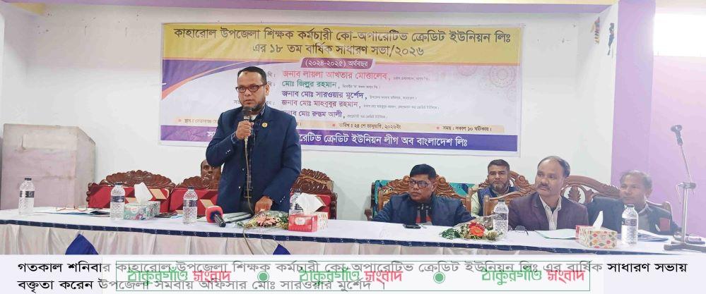 কাহারোল (দিনাজপুর) প্রতিনিধি: দিনাজপুরের কাহারোল উপজেলা শিক্ষক কর্মচারী কো-অপারেটিভ ক্রেভিট ইউনিয়ন লিঃ-এর বার্ষিক সাধারণ সভা অনুষ্ঠিত হয়েছে। গতকাল শনিবার সকাল ১১ টার সময় কাহারোল কমিউনিটি সেন্টারে দি কো-অপারেটিভ ক্রেটিভ ইউনিয়ন লীগ অব বাংলাদেশ লিঃ (কালব্) এর সহযোগীতায় কাহারোল উপজেলা শিক্ষক কর্মচারী কো-অপারেটিভ ক্রেভিট ইউনিয়ন লিঃ-এর ১৮তম বার্ষিক সাধারণ সভা সংগঠনের চেয়ারম্যান মোঃ মাহবুবুর রহমানের সভাপতিত্বে অনুষ্ঠিত হয়। এতে প্রধান অতিথি ছিলেন কালব্ লিঃ এর ভাইস চেয়ারম্যান মোছাঃ লায়লা আখতার মোত্তালেব। বিশেষ অতিথি ছিলেন যথাক্রমে কালব লিঃ এর ‘ক’ অঞ্চলের ডিরেক্টর মোঃ জিল্লুর রহমান, উপজেলা সমবায় অফিসার মোঃ সারওয়ার মুর্শেদ। সভায় অন্যন্যাদের মধ্যে বক্তব্য রাখেন দিনাজপুর ও নীলফামারী কালব লিঃ এর সহকারি জেনারেল ব্যবস্থাপক ইমরান আহমেদ, সেক্রেটারী মোঃ রুস্তম আলী, শিক্ষক কর্মচারী কো-অপারেটিভ ক্রেডিট লিঃ এর ভাইস চেয়ারম্যান মিঃ নিত্য গোপাল রায়, কালব এর উপজেলা শাখা ব্যবস্থাপক মোঃ আব্দুস সবুর, ট্রেজারার মিঃ মর্ম চন্দ্র রায়, ডিরেক্টর পরিমল চন্দ্র রায়, ডিরেক্টর মোঃ জোবাইদুর রহমানসহ বিভিন্ন শিক্ষাপ্রতিষ্ঠানের শিক্ষক,কর্মচারীবৃন্দ। বার্ষিক সাধারণ সভা সঞ্চালনা করেন সংগঠনের সেক্রেটারী মোঃ রুস্তম আলী