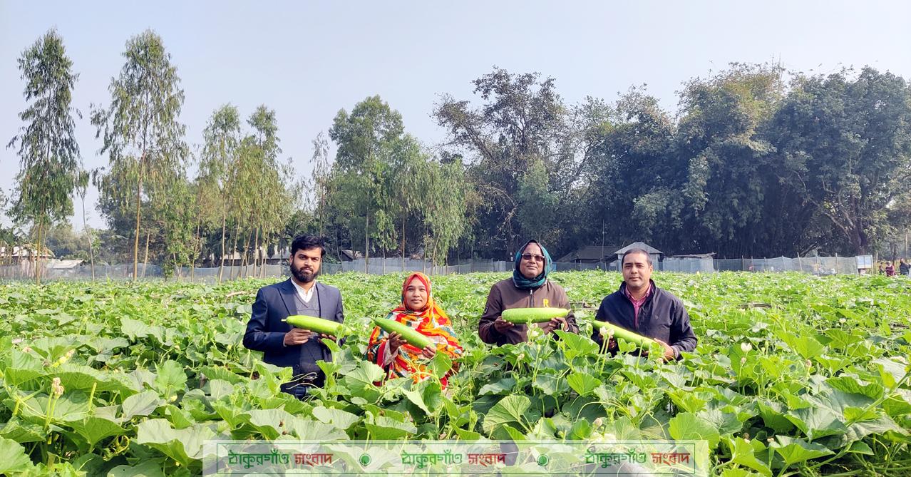 উপজেলা কৃষি অফিস সূত্রে জানা যায়, কৃষি সম্প্রসারণ অধিদপ্তরের আওতায় বাস্তবায়নাধীন দিনাজপুর অঞ্চল টেকসই কৃষি উন্নয়ন প্রকল্প (১ম সংশোধিত)–এর অংশ হিসেবে খানসামা উপজেলায় নিরাপদ ও জৈব পদ্ধতিতে সবজি উৎপাদনে কৃষকদের উদ্বুদ্ধ করা হচ্ছে। এরই ধারাবাহিকতায় প্রকল্পের সহায়তায় বাশুলী গ্রামে ২০ শতক জমিতে জৈব সবজি উৎপাদনের একটি প্রদর্শনী স্থাপন করেন কৃষক আমিনুল ইসলাম। পরবর্তীতে নিজ আগ্রহে তিনি আরও ৮০ শতক জমিতে সুপার গ্রিন জাতের লাউ চাষ সম্প্রসারণ করেন।